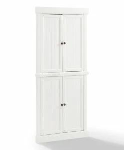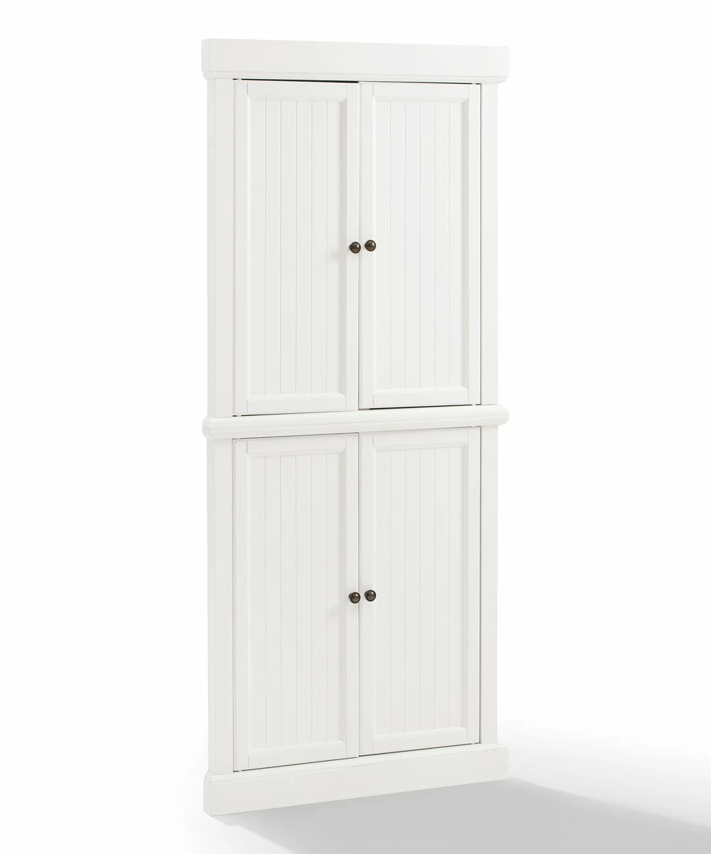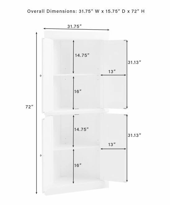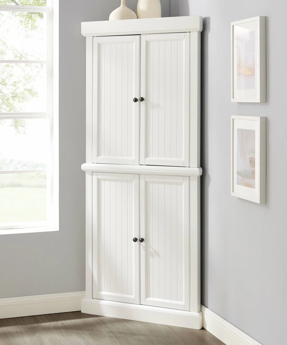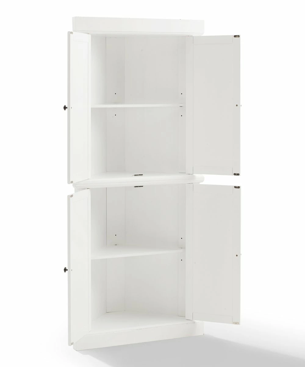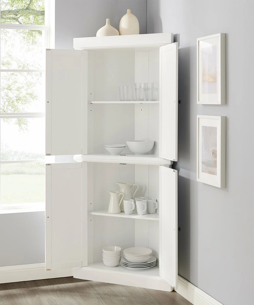 Roomy corner pantry featuring two cabinets with magnetic closures and adjustable shelves.