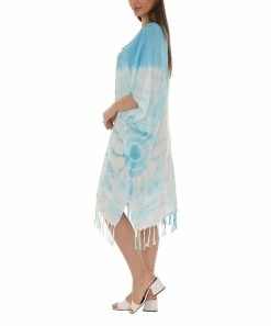 Breezy tie-dye caftan featuring an embroidered v-neck, relaxed three-quarter sleeves and a fringed side-split hem.