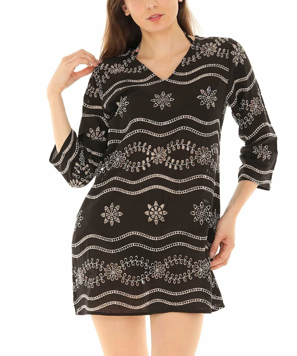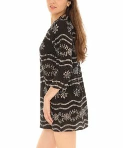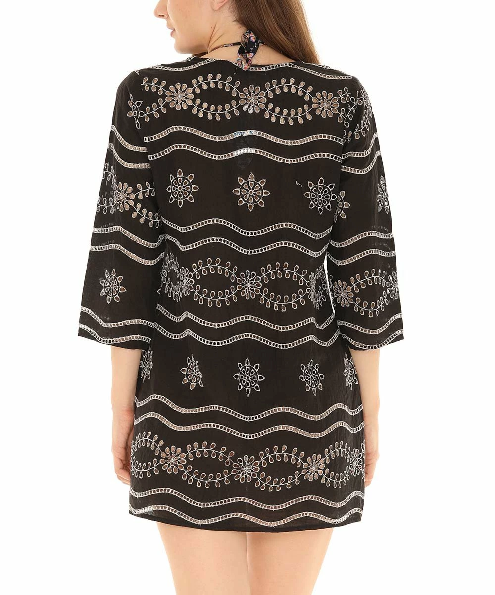 Crafted from mesh that dons delicately embroidered eyelets, this three-quarter sleeve cover-up offers moderate sunny-day coverage while maintaining your beachy-chic style.