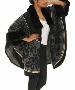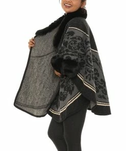 Layer up in luxury when you shrug on this novelty poncho featuring a floral pattern and faux fur trim.