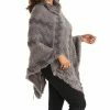 Flowy poncho featuring fringed edges and a sweater-like material and style.