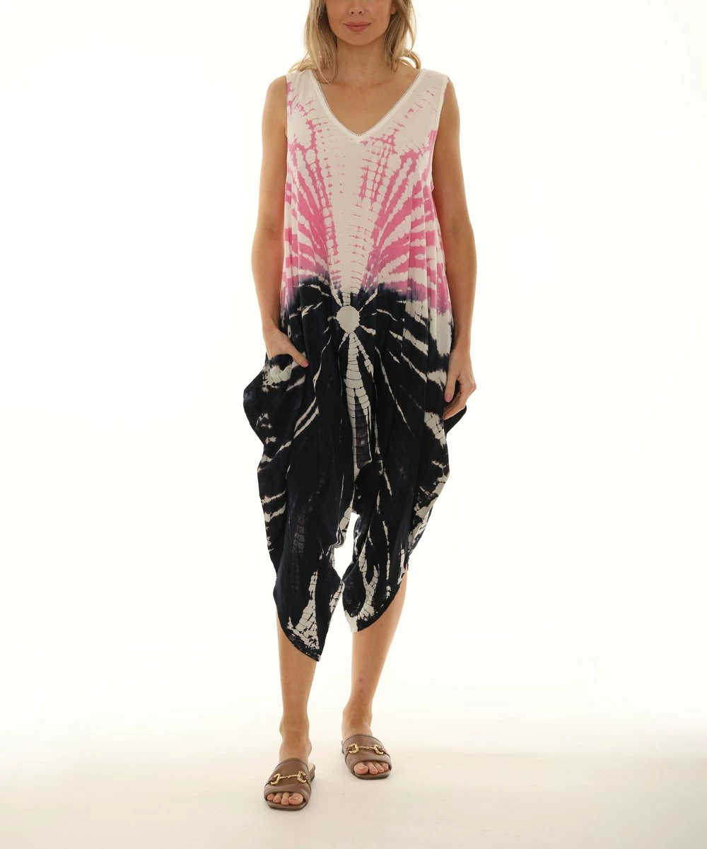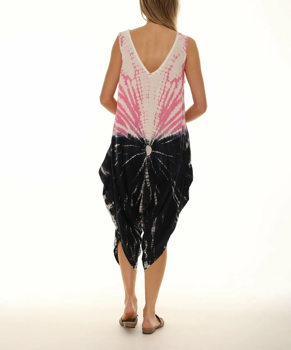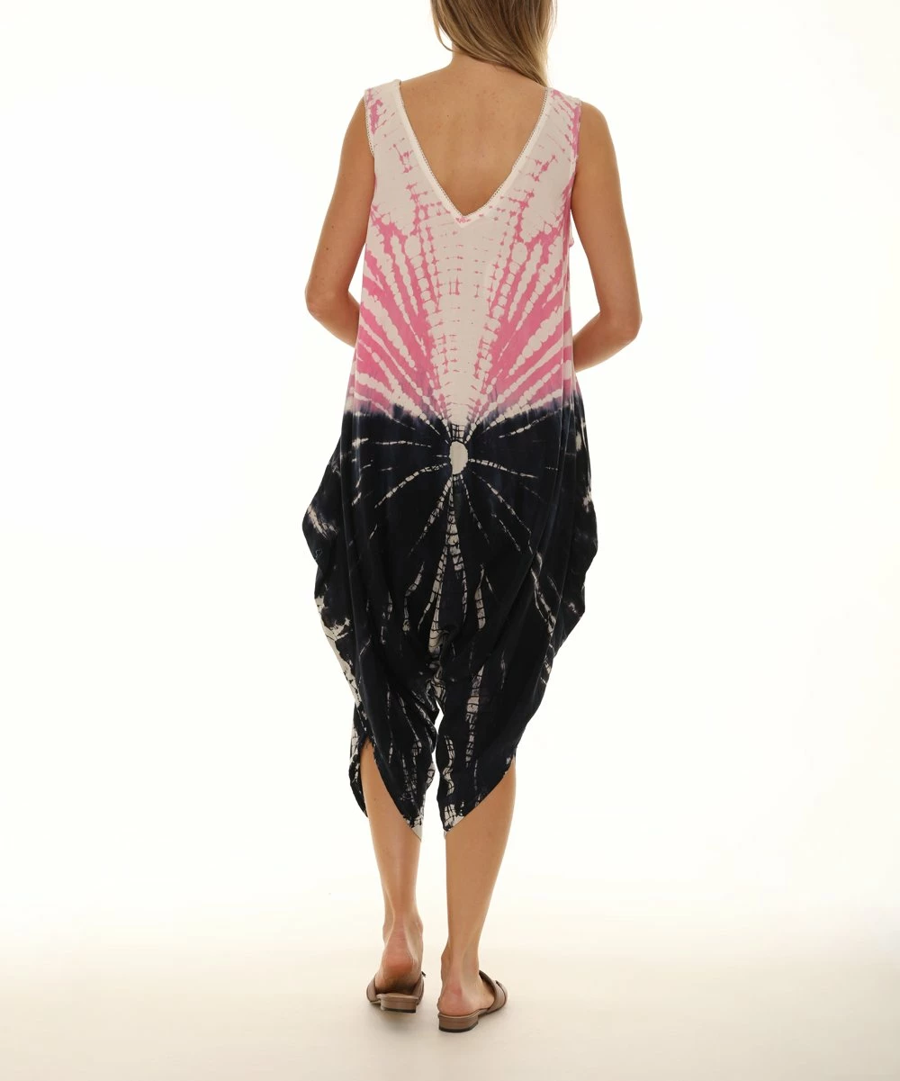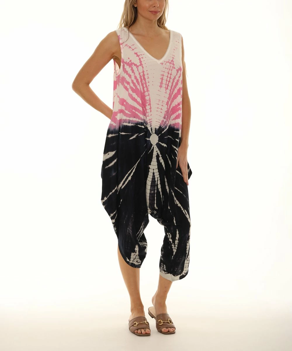 This on-trend jumpsuit features harem-style pants and a front and back v-neckline.