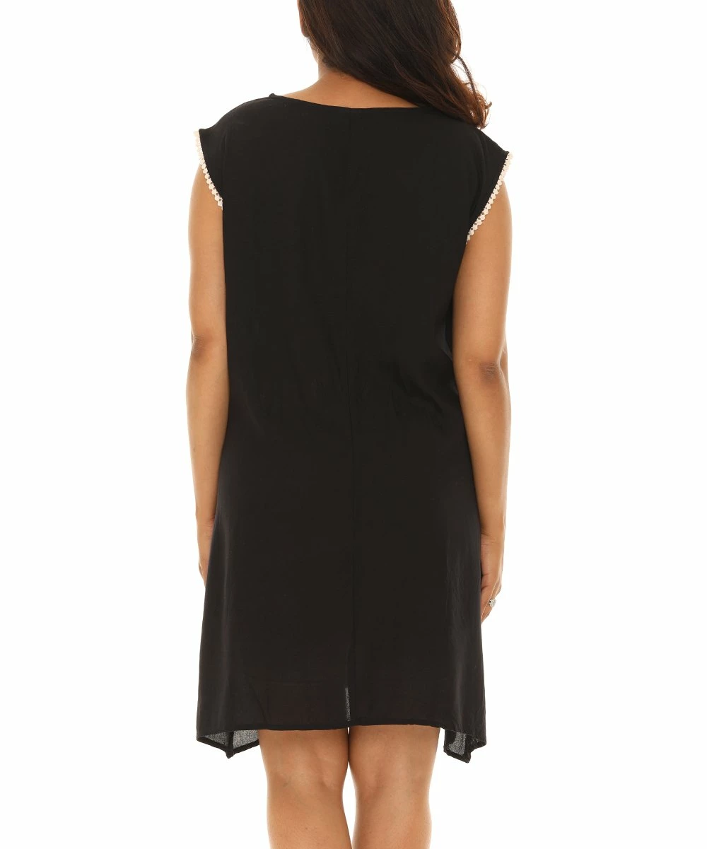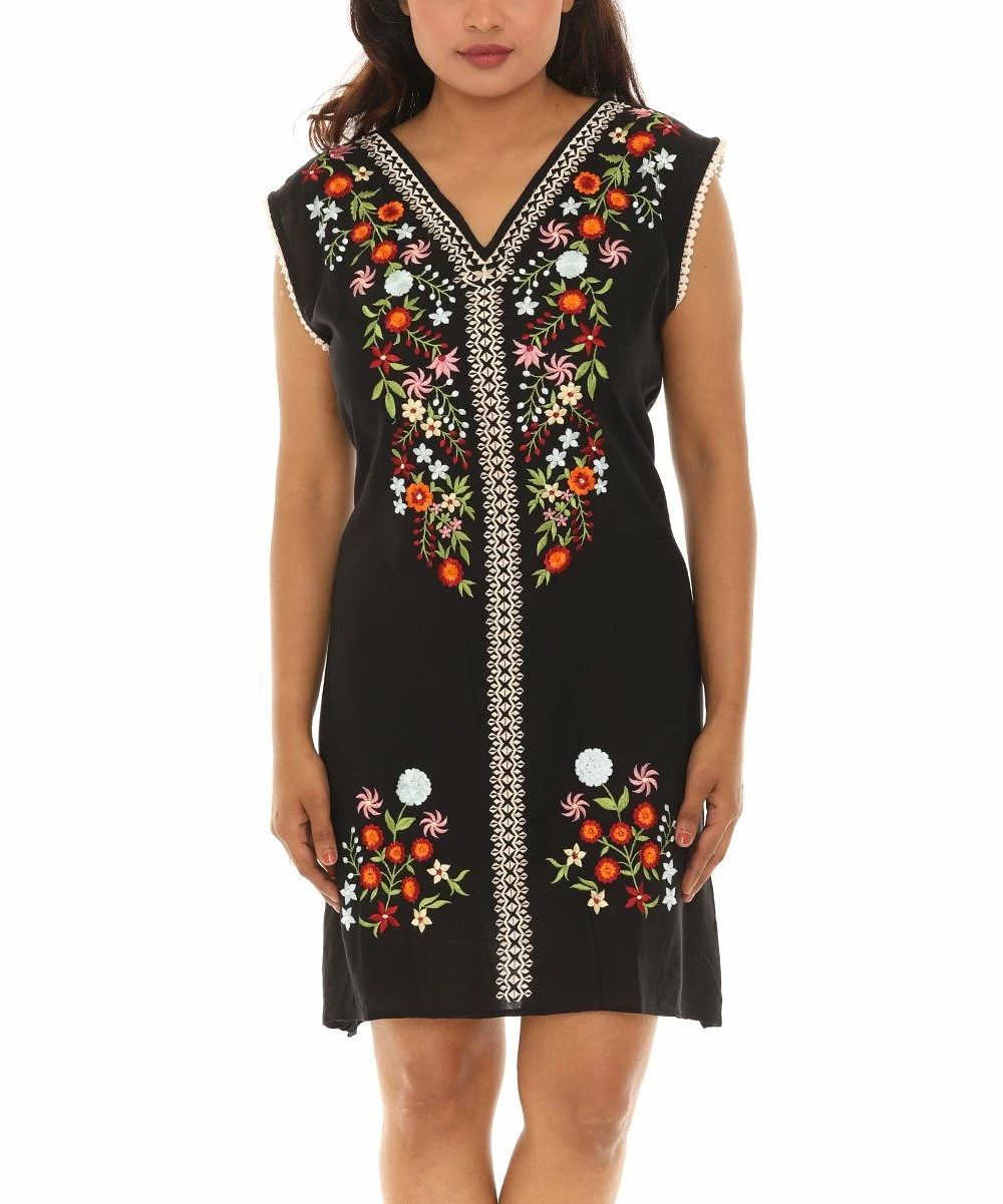 A v-neck dress featuring cap sleeves and floral embroidery down the front midline.