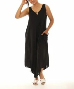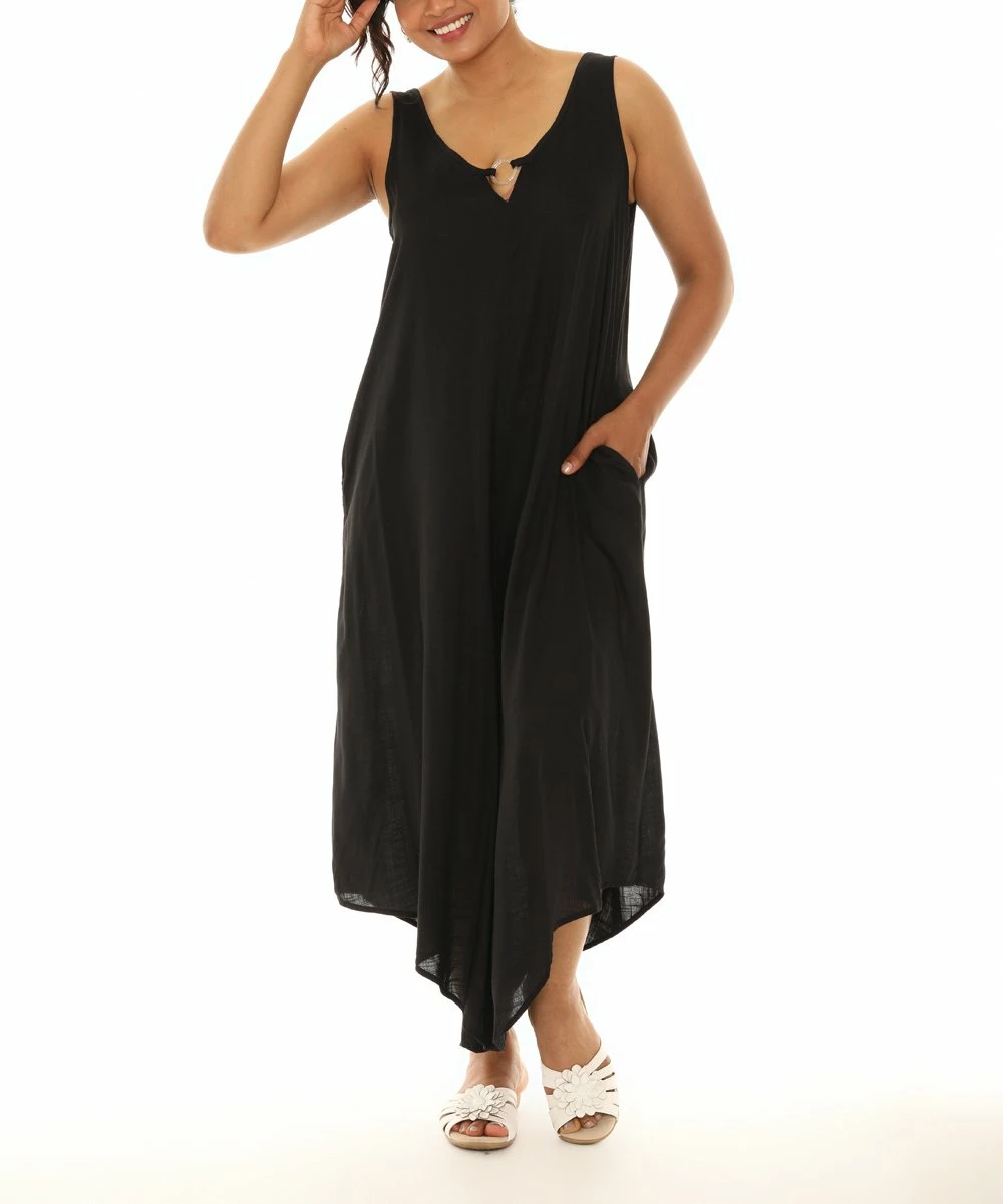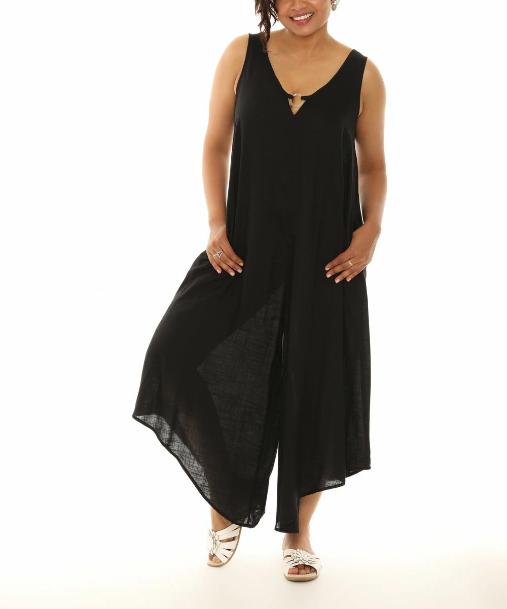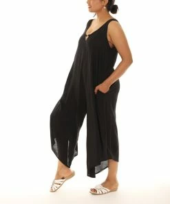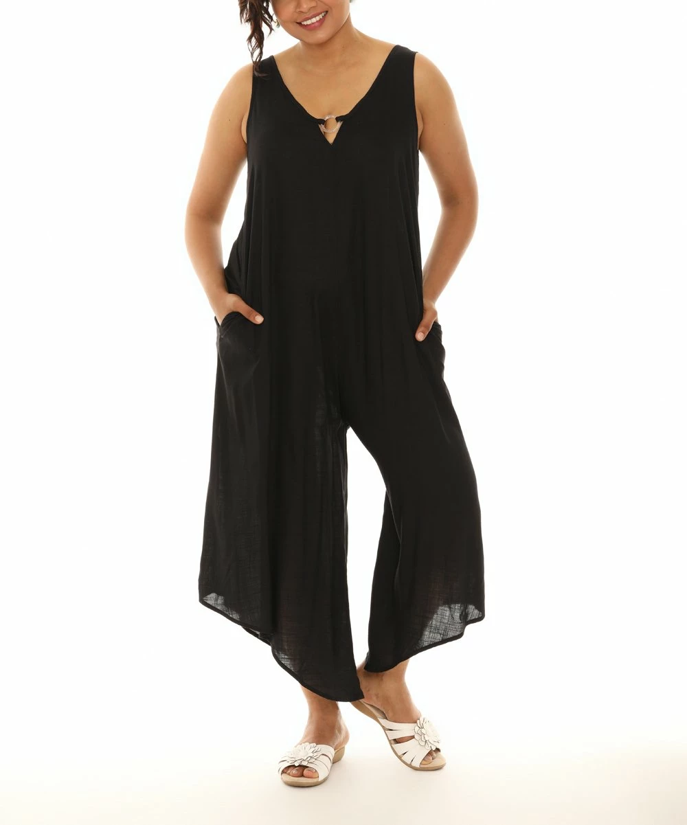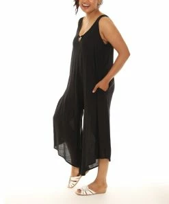 A breezy, capri-cut jumpsuit featuring a circle accent, pockets and a lightweight construction.