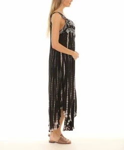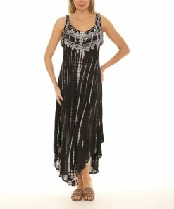 A dynamic option for travel or weekend gatherings, this embroidered dress flaunts a trend-right curved hem and a statement-making print.