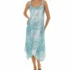This tie-dyed shift dress features soft fabric and embroidered details for comfortable boho-inspired style.