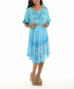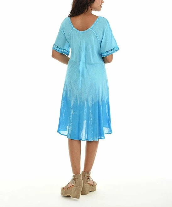 Stay comfy as can be in this flowing shift dress featuring intricate patterns and tie-dye detailing for a boho vibe.