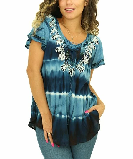 Boho details like a tasseled lace-up front, flowy cut and v-shaped floral border neckline lend this tie-dye tunic a laid-back beachy vibe.