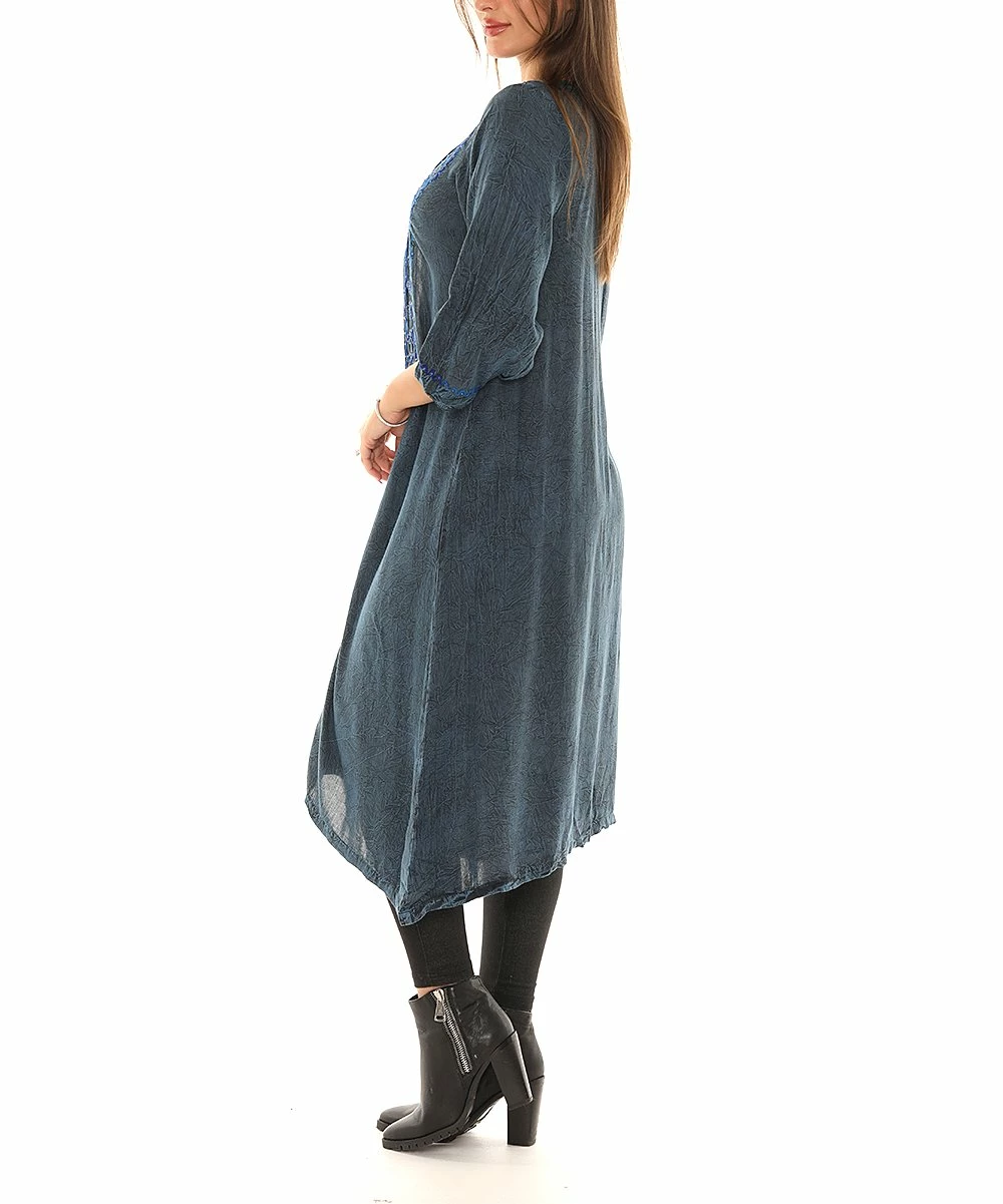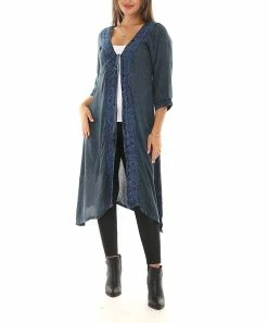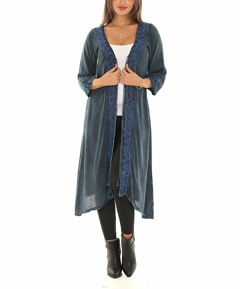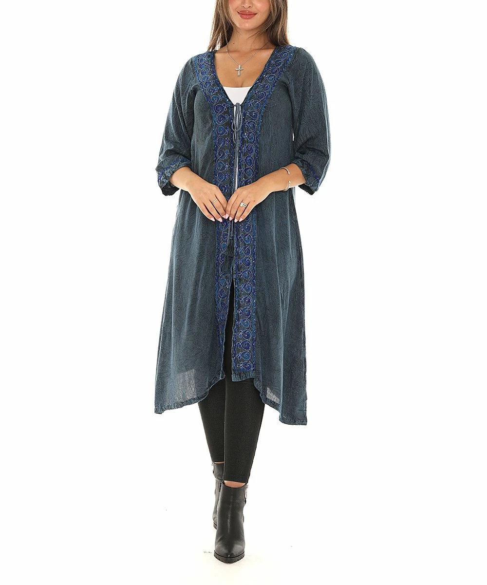 This bohemian-style duster has three-quarter length sleeves and sequin-accented embroidery for an extravagant look.