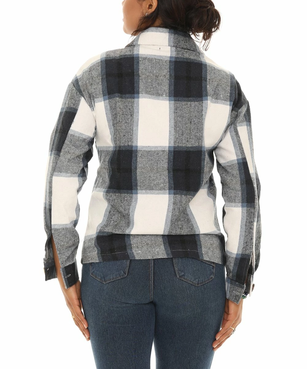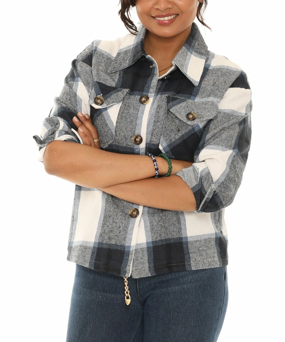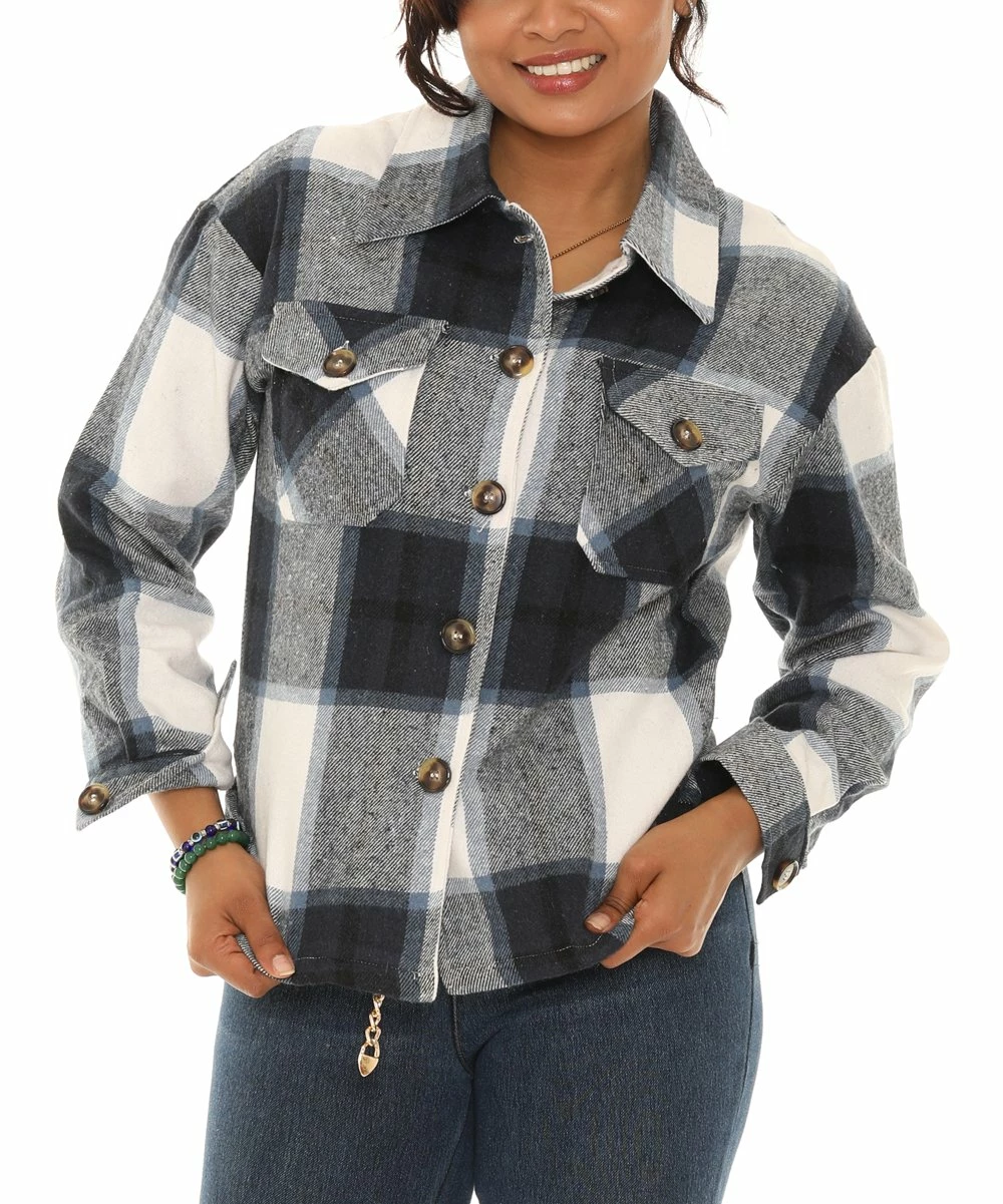 This long-sleeve shacket is designed with a button closure and side pockets.