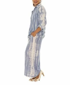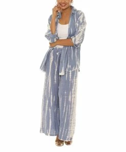 - Includes blue and white tie-dye button-up and blue and white tie-dye gaucho pants (two pieces total)