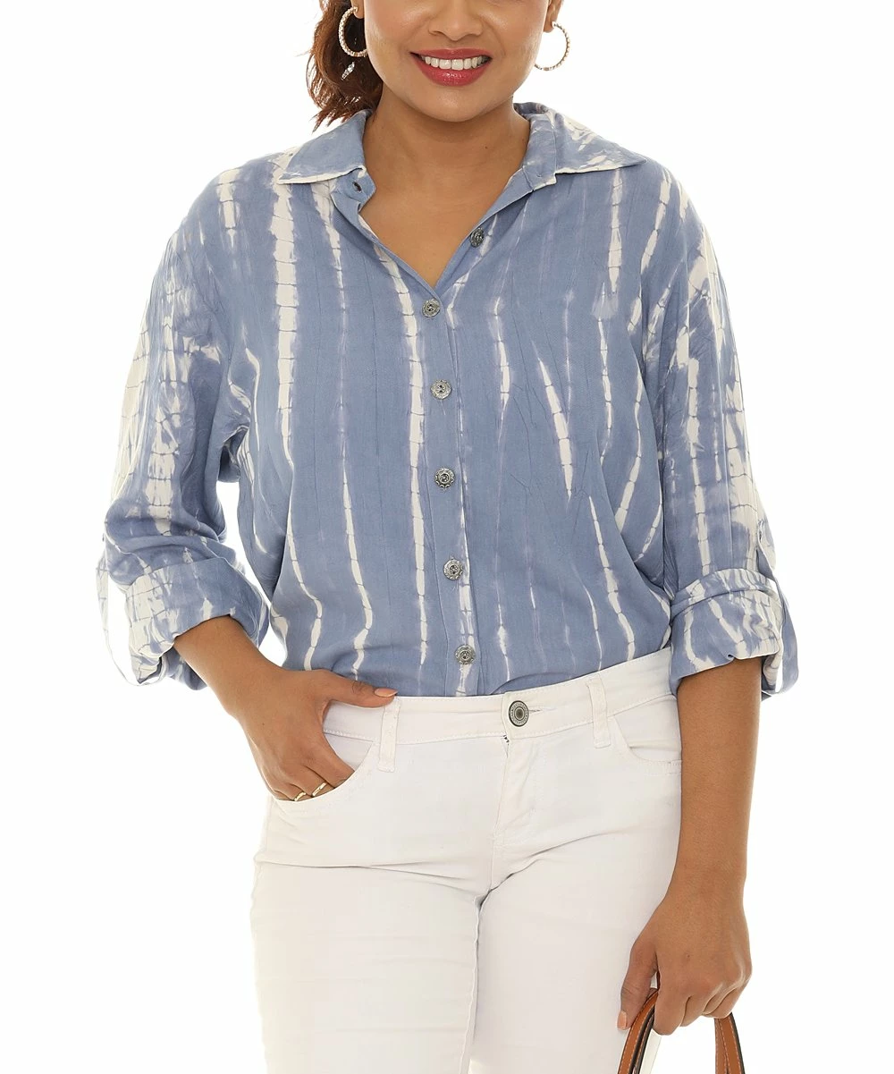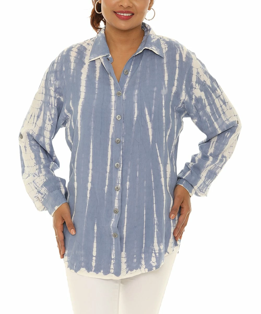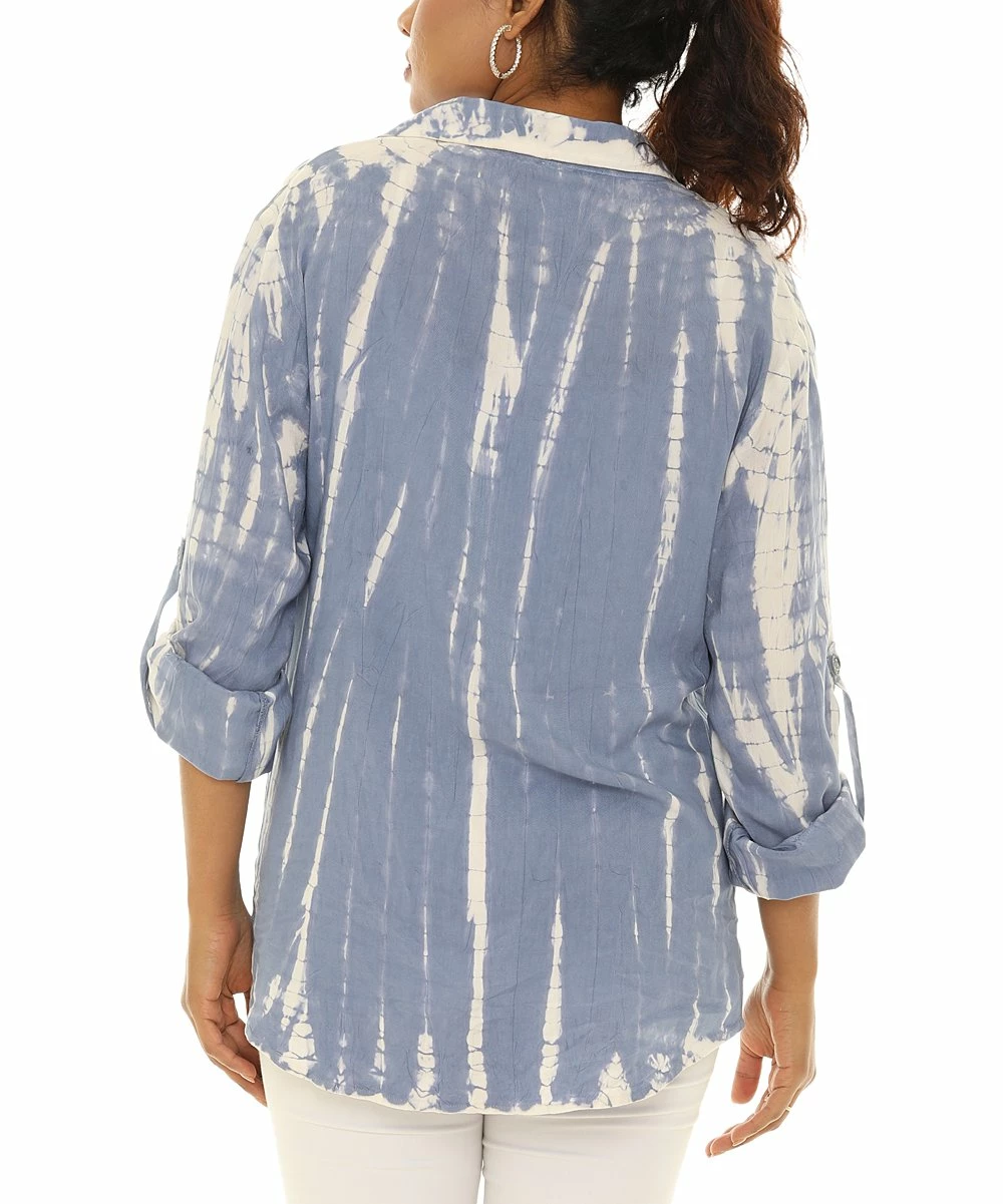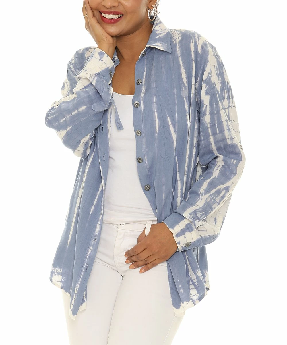 Classic button-up with rollable long sleeves and a shibori-style tie-dye print.