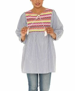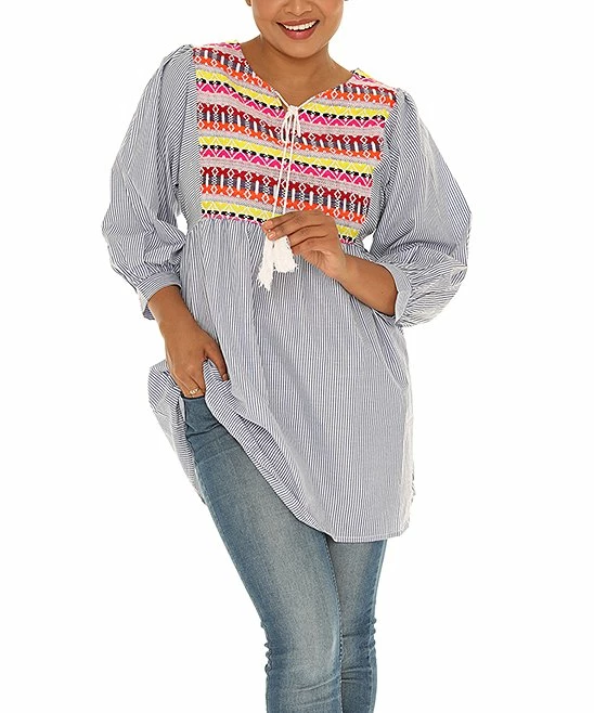 Craft unique ensembles starring this colorful tunic boasting embroidered details and a stylish V-neck design.