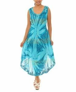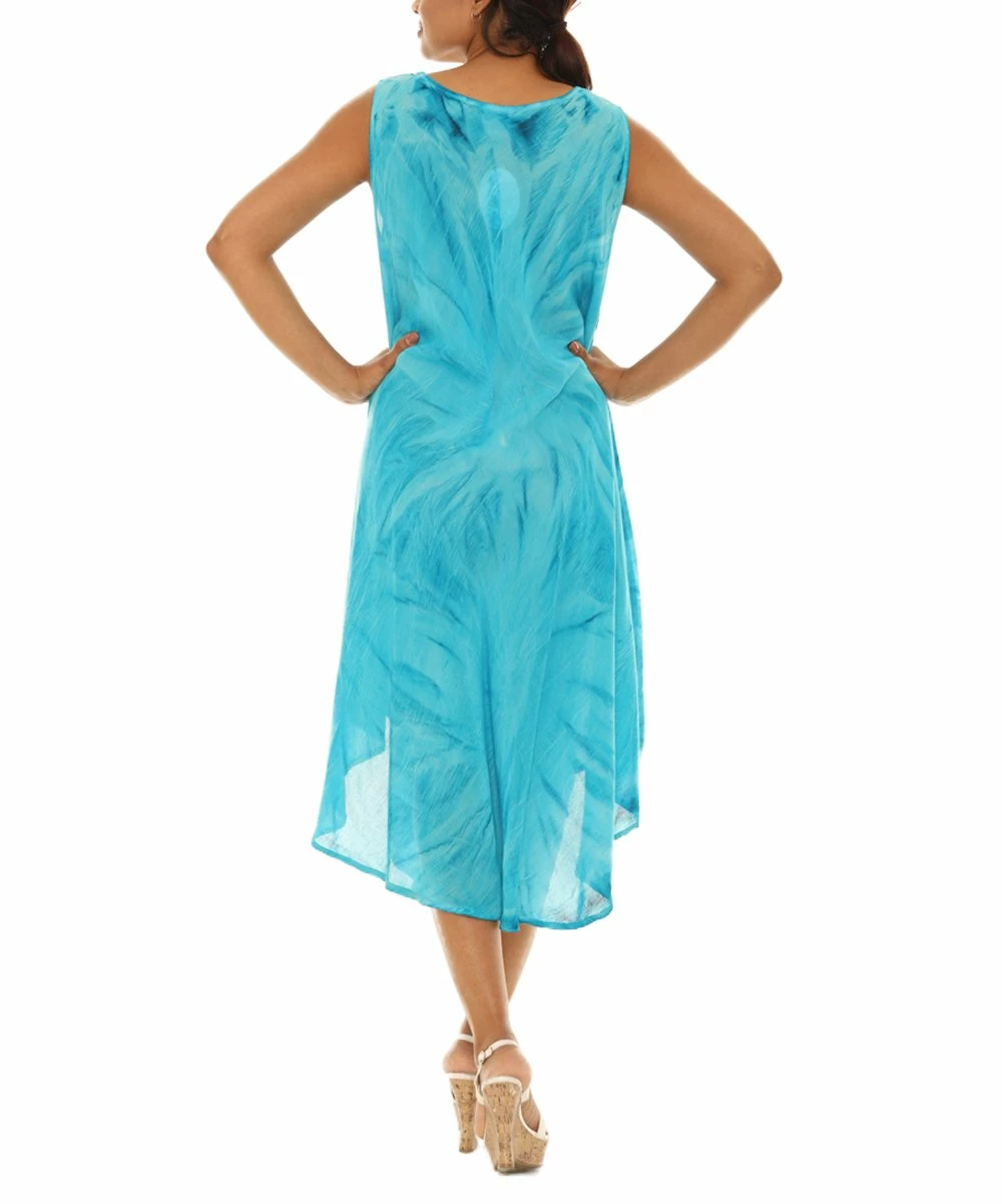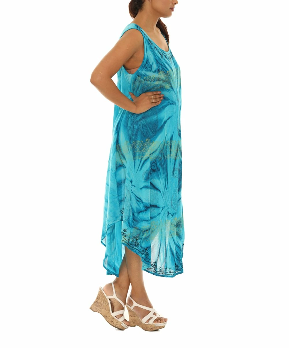 A sleeveless midi dress featuring vibrant tie-dye and delicate paisley accents.