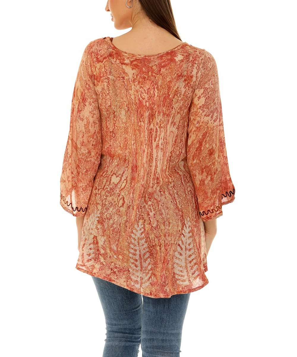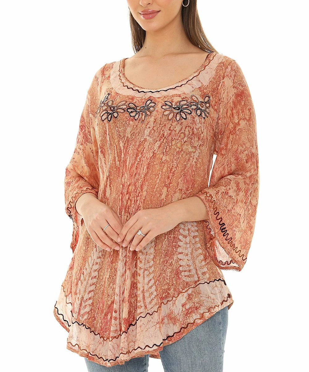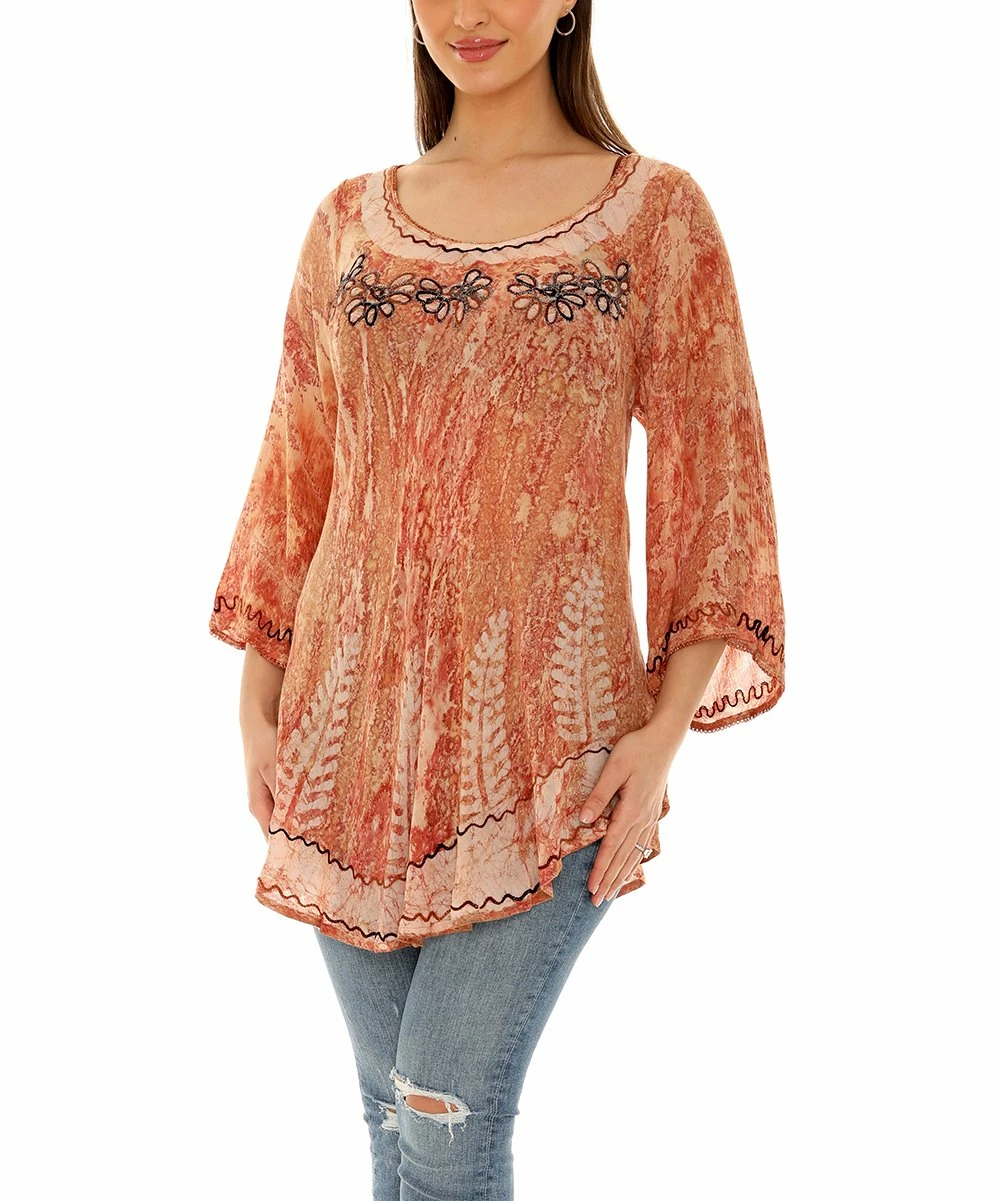 Bring a dose of boho to your daily wardrobe with this supersoft tie-dye tunic featuring embroidered details and flared bell sleeves for comfortably stylish wear that pairs perfectly with jeans or leggings.