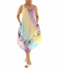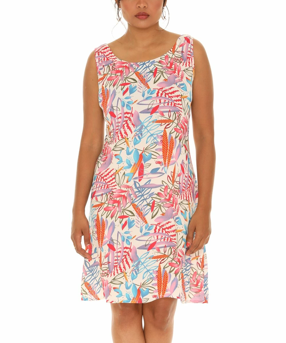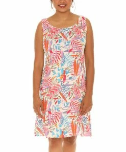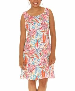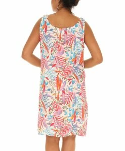 Bring a tropical touch to your warm-weather wardrobe with this colorful sleeveless dress flaunting a soft, lightweight fabric and classic crew neckline.