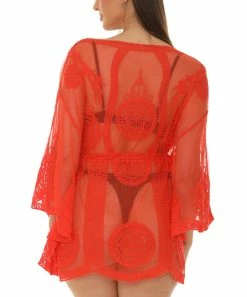Cover up in style with this sheer crochet lace tunic featuring three-quarter bell sleeves, a scoop neck and a scalloped hem.