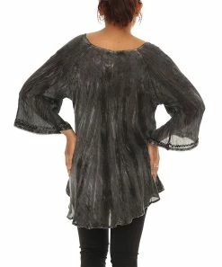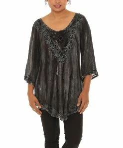Three-quarter sleeve tunic featuring rhinestone trim and embroidered detailing.