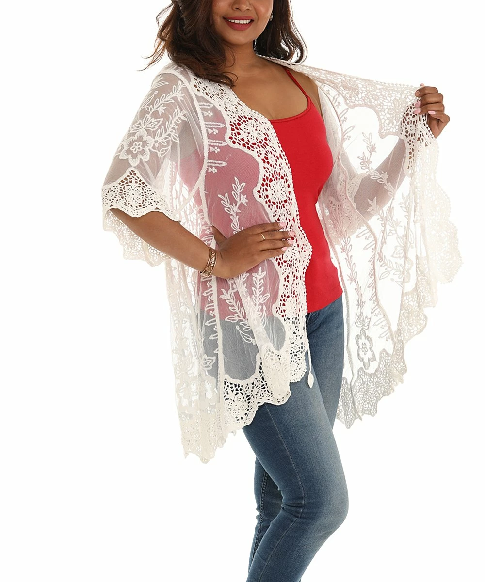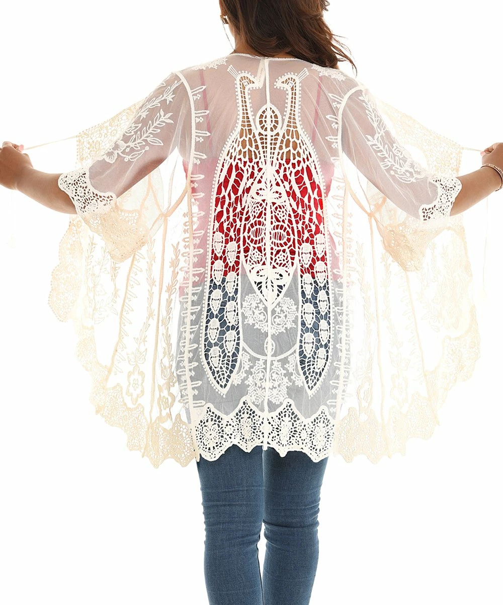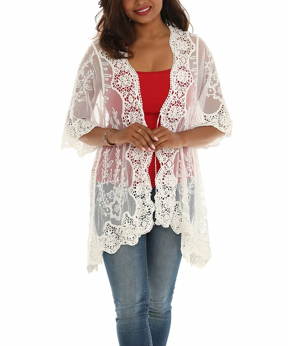 Add an extra layer of style to your ensemble with this lace three-quarter sleeve duster featuring a sheer design.