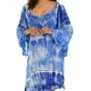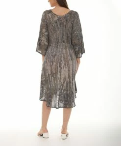This three-quarter sleeve dress is designed with an embroidered round neckline and flowy curved hem.