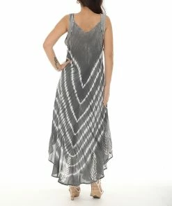 Sleeveless tie-dye maxi dress with a flowy handkerchief hem, front-and-back v-neck and decorative embroidery for a boho look.