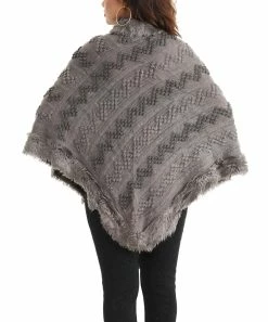 Slip-on this poncho that features a crocheted zigzag pattern and a faux fur trim to keep you stylish and warm.