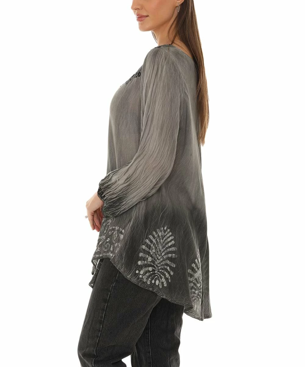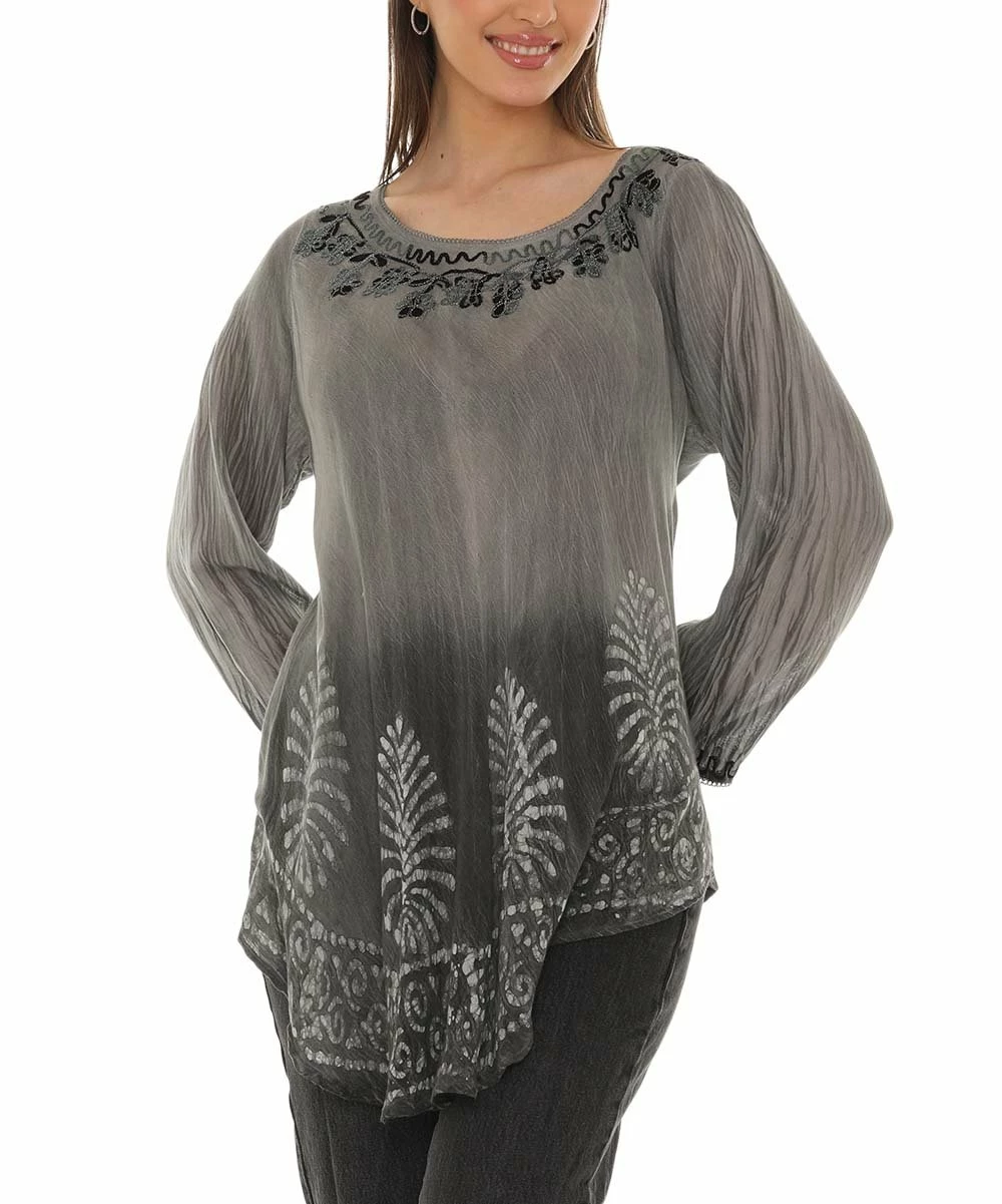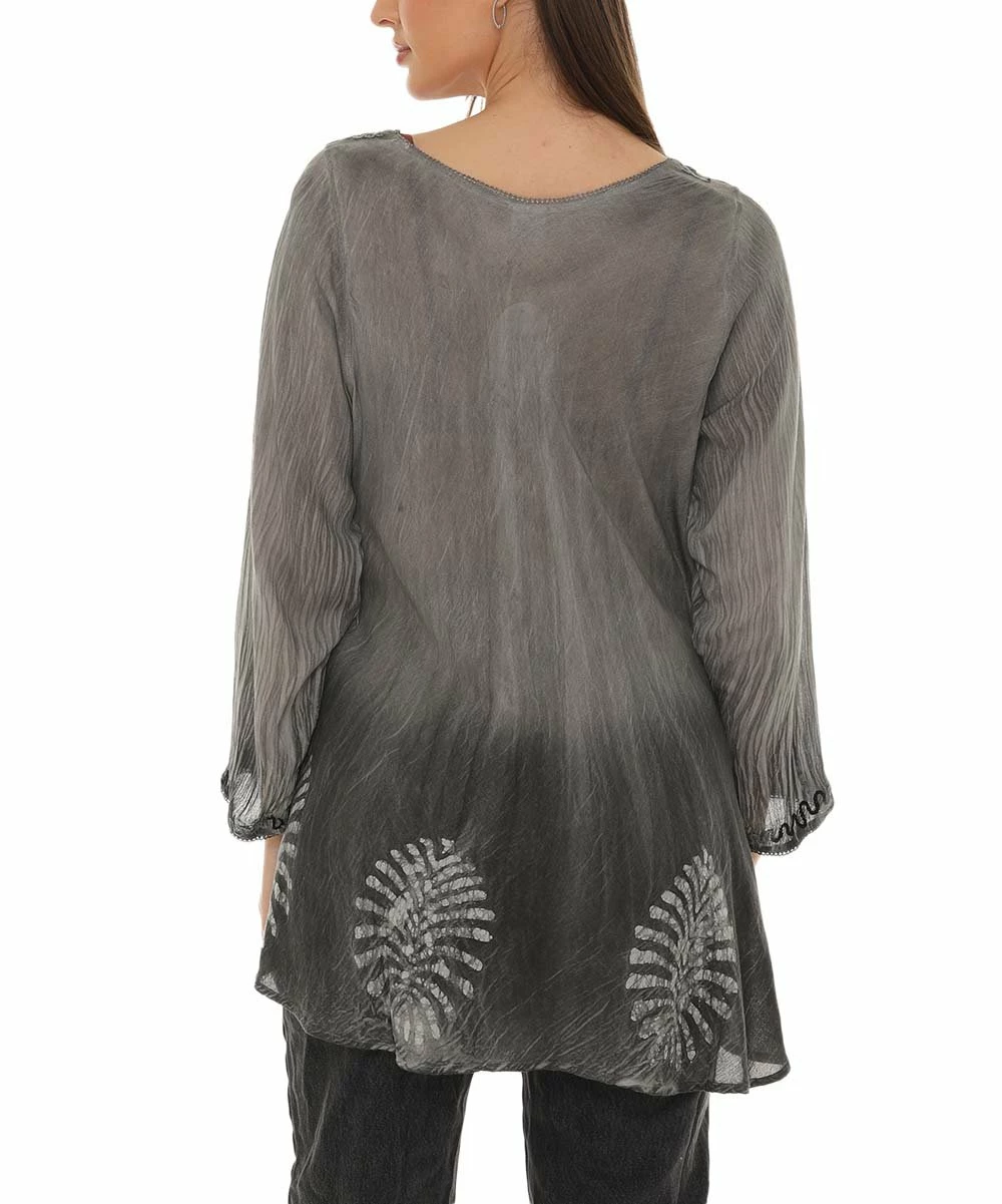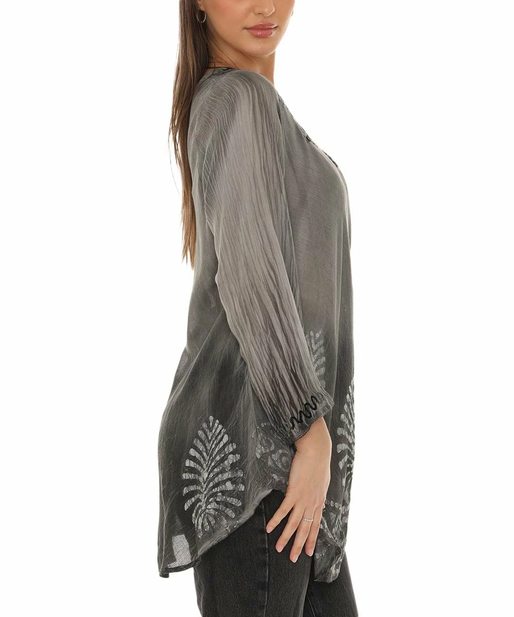 Add a bohemian feel to your casual ensembles by donning this soft long-sleeve tunic crafted with a bold tie-dye print and an embroidered neckline.