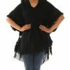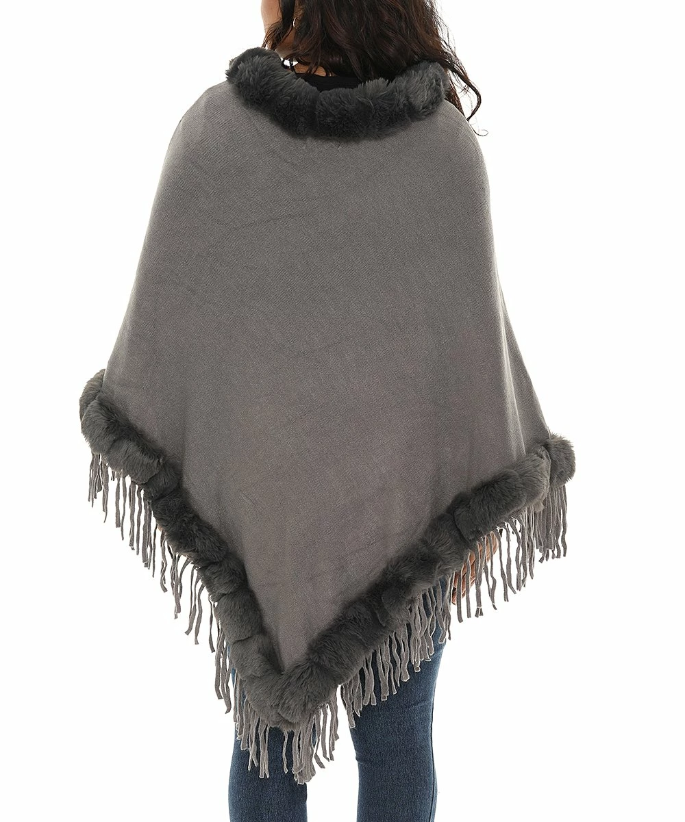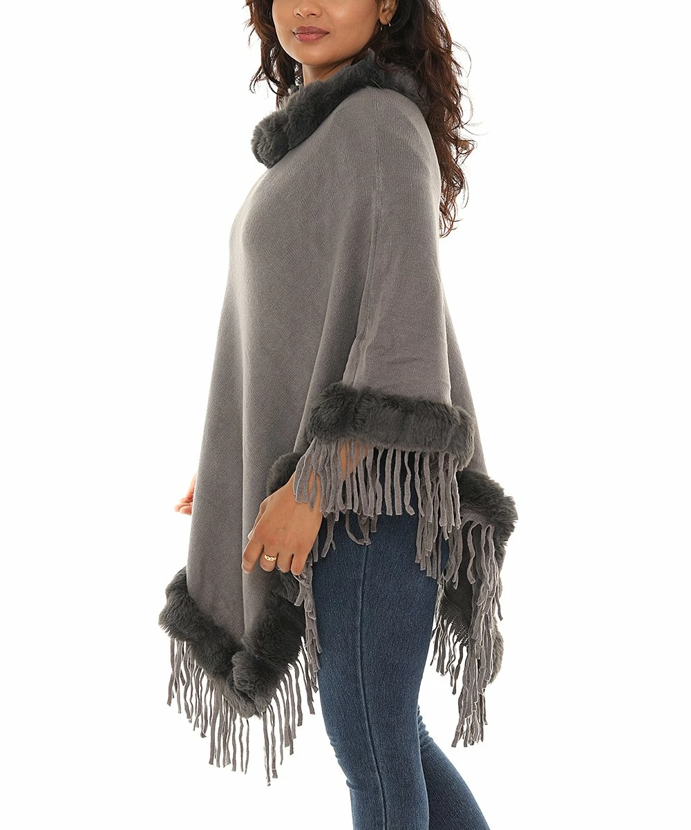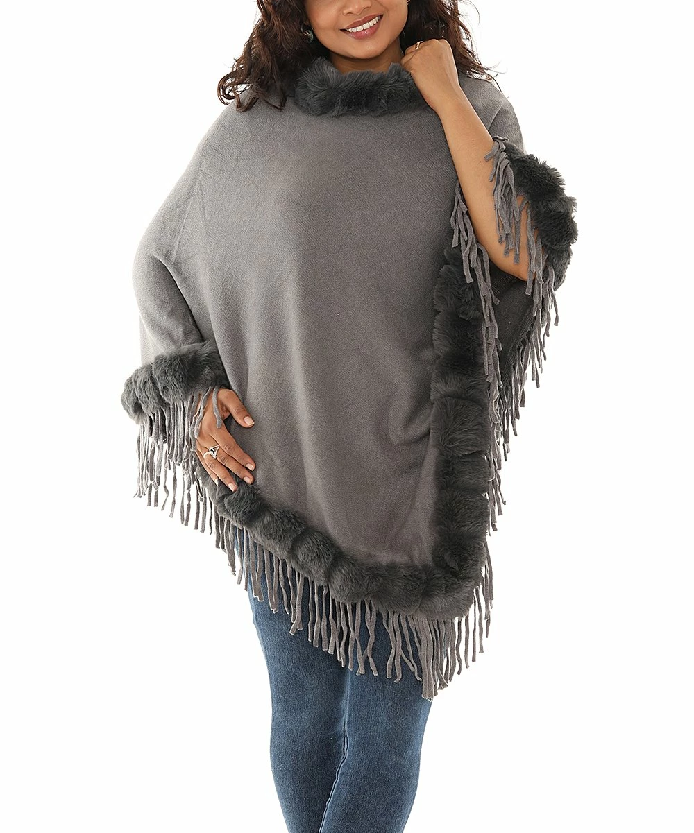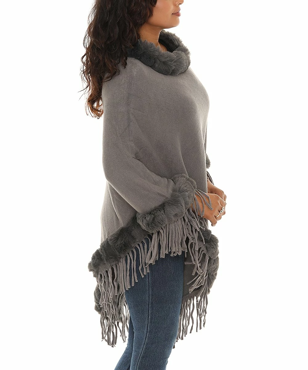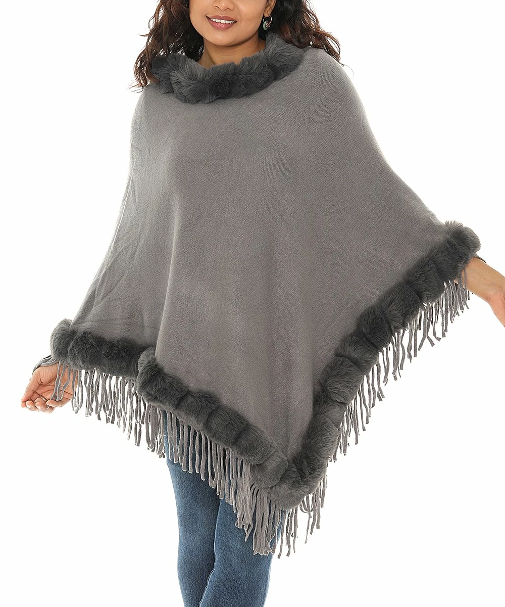 Soft poncho featuring a faux fur collar and trim with fringed hem.