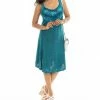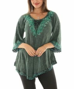 Three-quarter sleeve scoop neck tunic featuring embroidered details and a lace-trimmed hem.