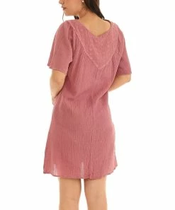 Secure your easygoing favorites with this breezy sheath dress finished with a collar, a v-neckline and garment-dye detail.
