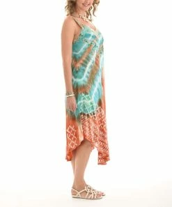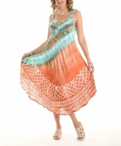 Express your boho side with this sleeveless dress that features a flowing, curved hem and a vibrant tie-dye design embellished with intricate print accents.