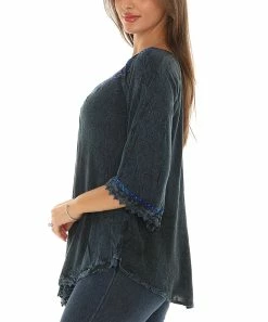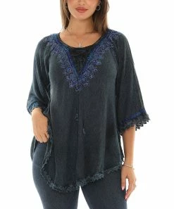 This bohemian-style scoop neck tunic has three-quarter length sleeves and a curved hem. The lace-up detail neckline, sequins and embroidery add an extravagant look.