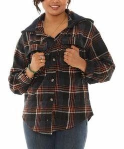 This plaid shacket is designed with long sleeves and a detachable hood.