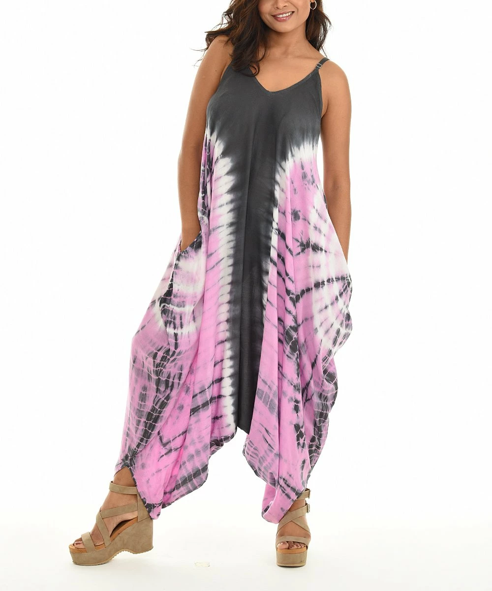 Welcome boho-chic appeal into your closet collection courtesy of this jumpsuit boasting a relaxed, sleeveless design and vibrant tie-dye print.