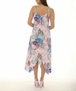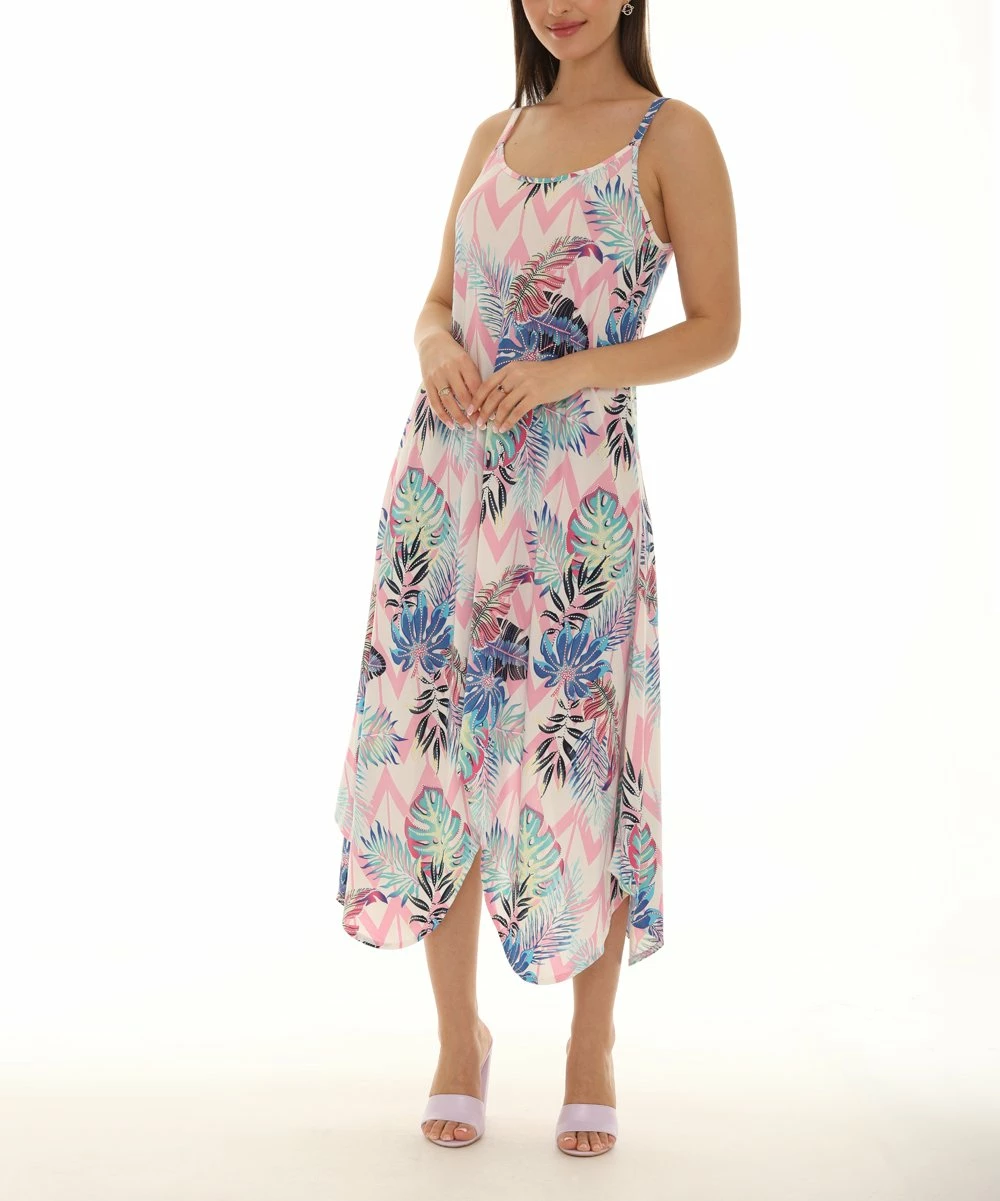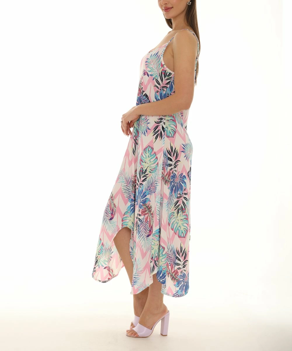 Flowy midi dress featuring a tropical print and handkerchief hemline.