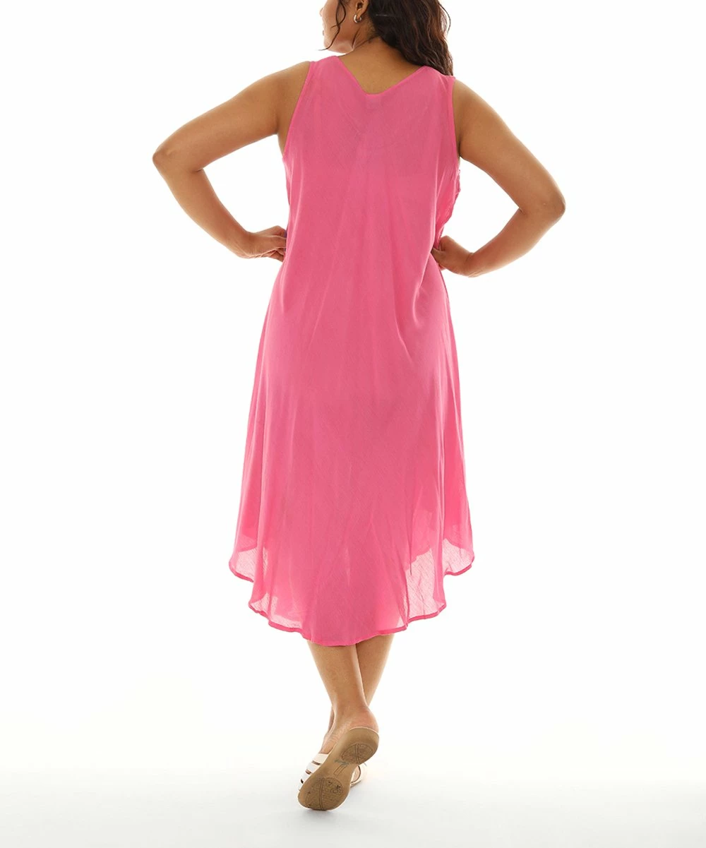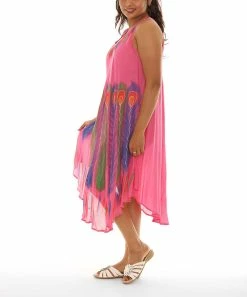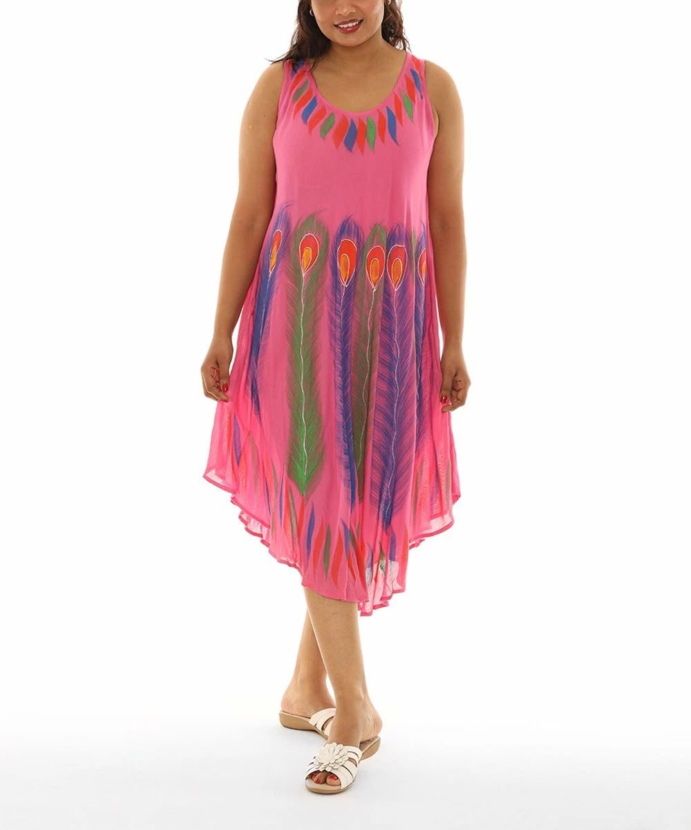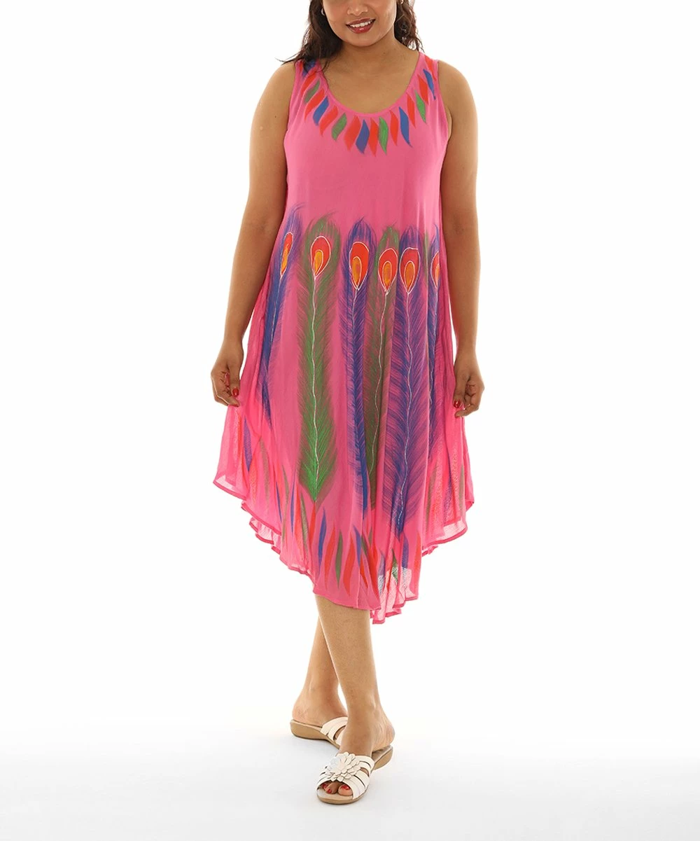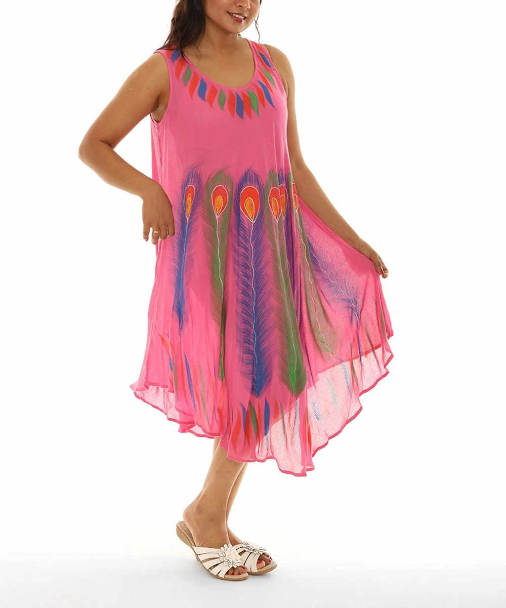 Add an elegant touch to your wardrobe with this sleeveless dress that features an eye-catching peacock design.