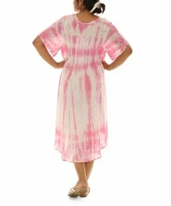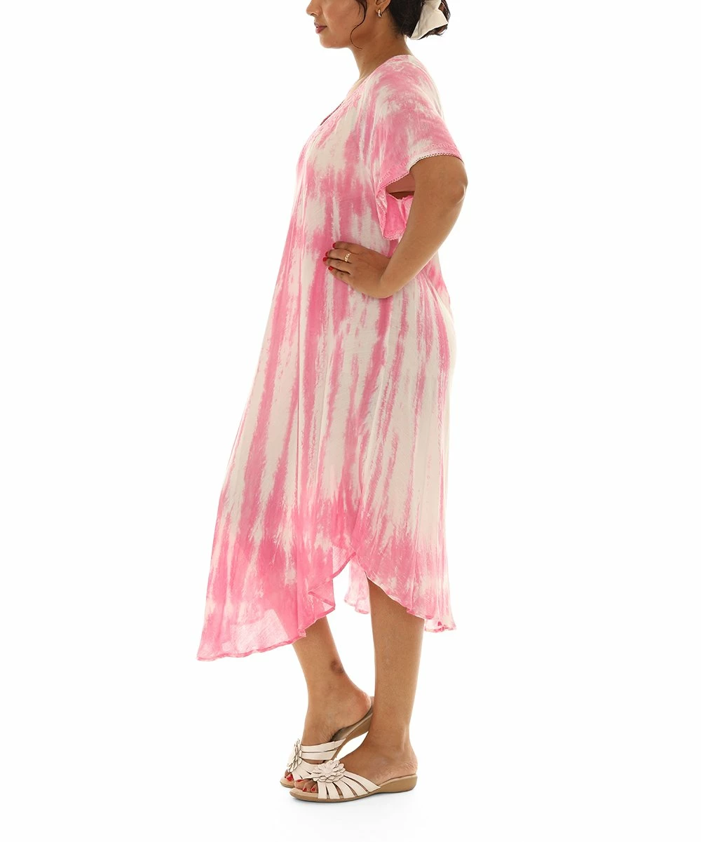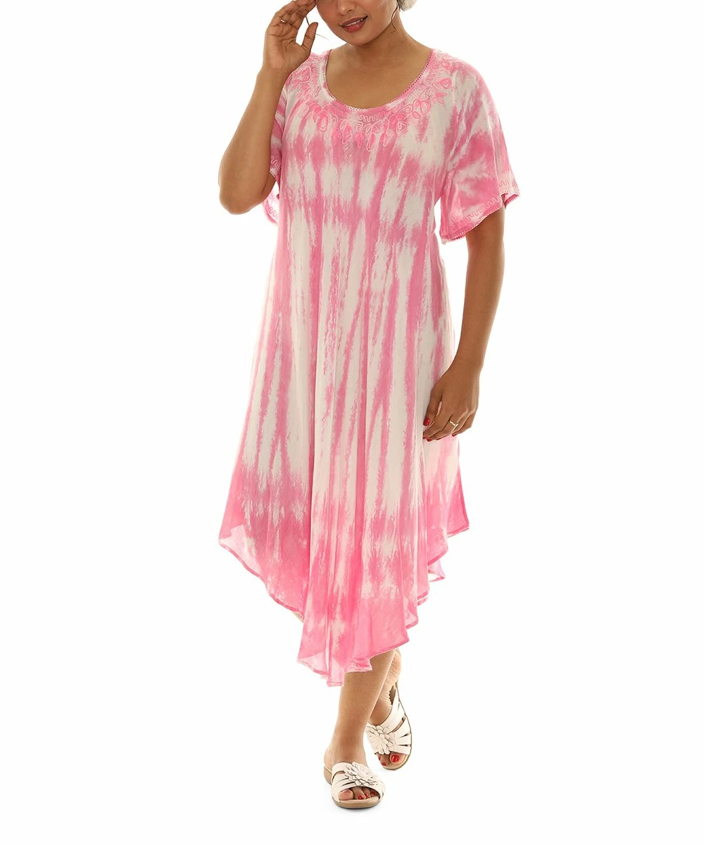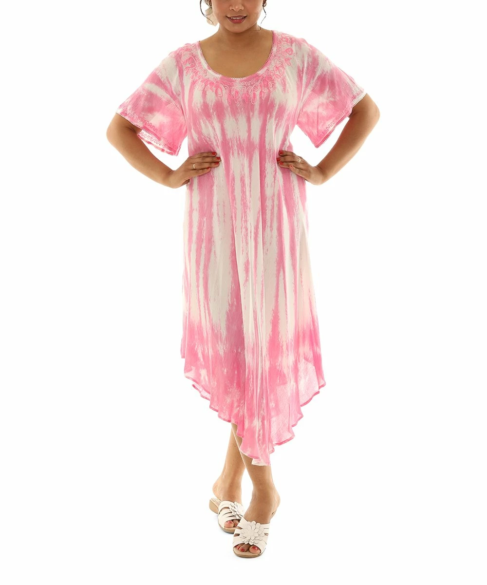 Half-sleeve dress with a flattering scoop neckline and an eye-catching tie-dye pattern.