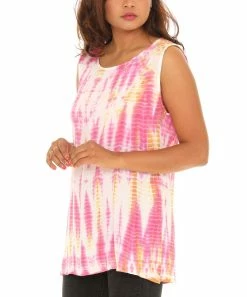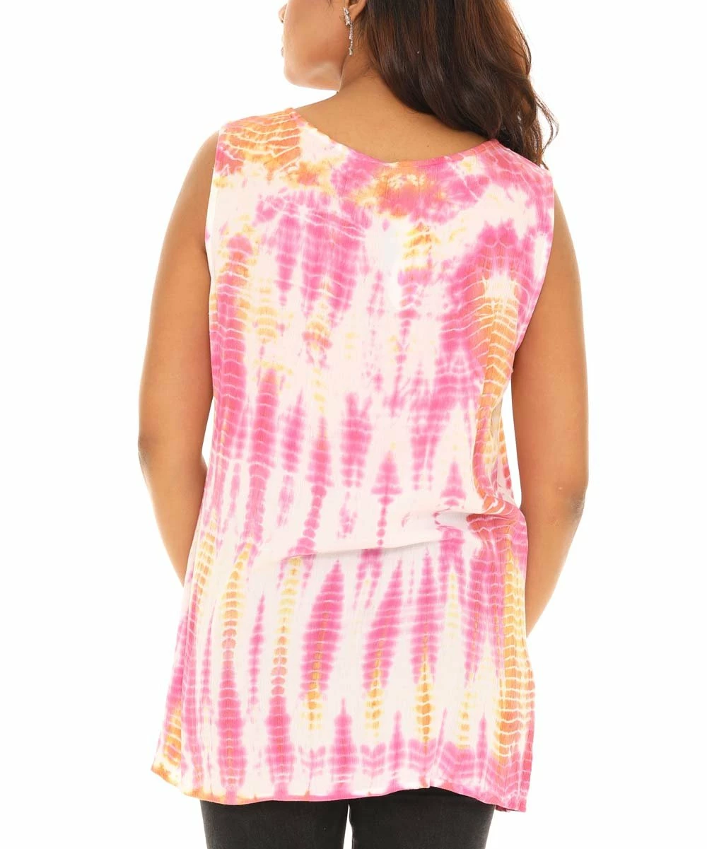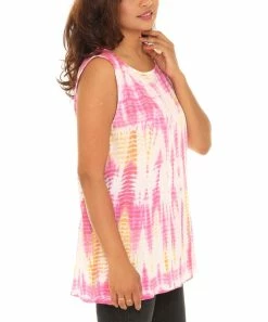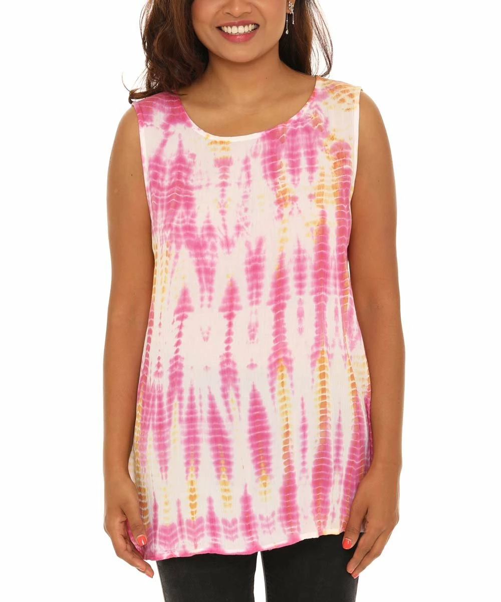 Add a vibrant touch to your warm-weather threads with this sleeveless tunic cut from fun tie-dye material and featuring a flattering scoop neckline.