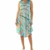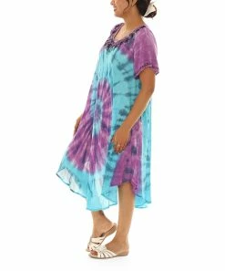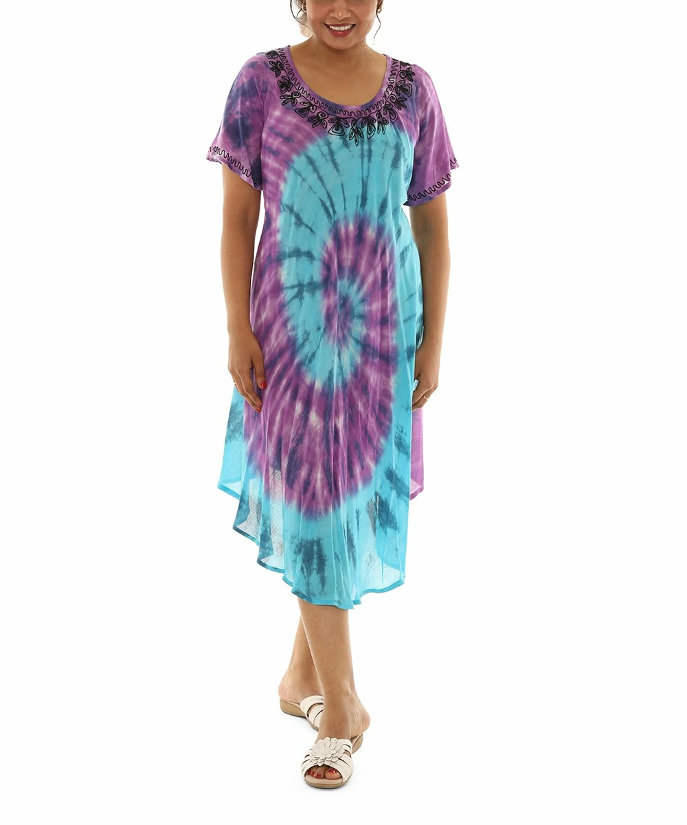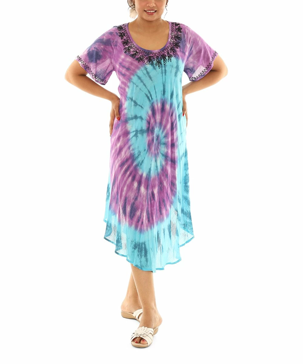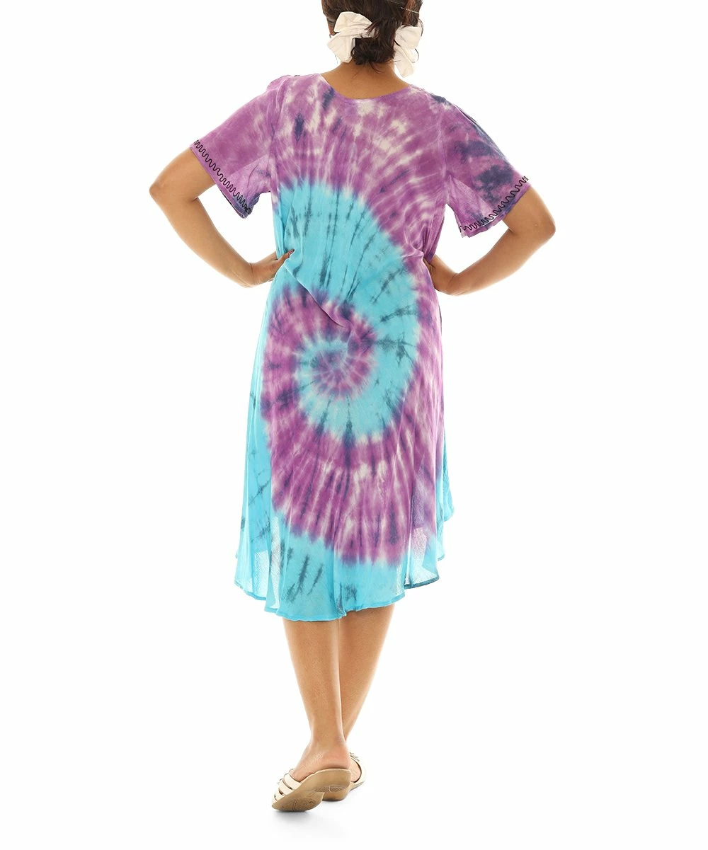 Half-sleeve dress with a flattering scoop neckline and an eye-catching tie-dye pattern.