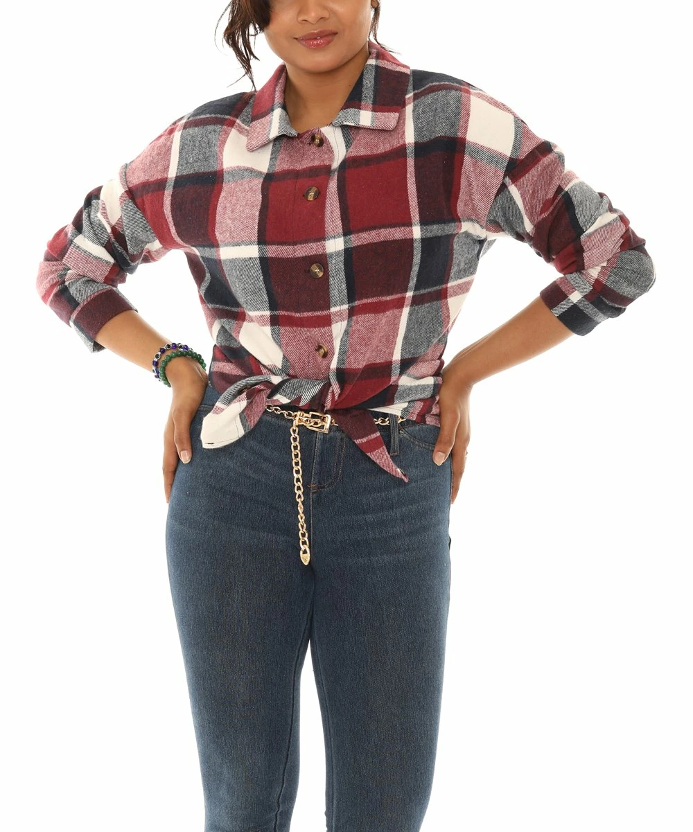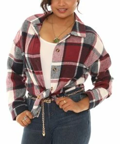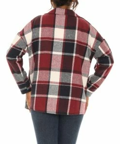 Button-up shacket featuring a plaid print.