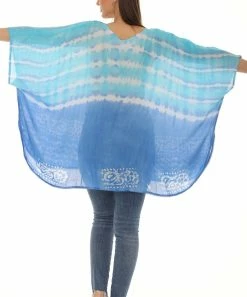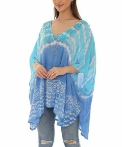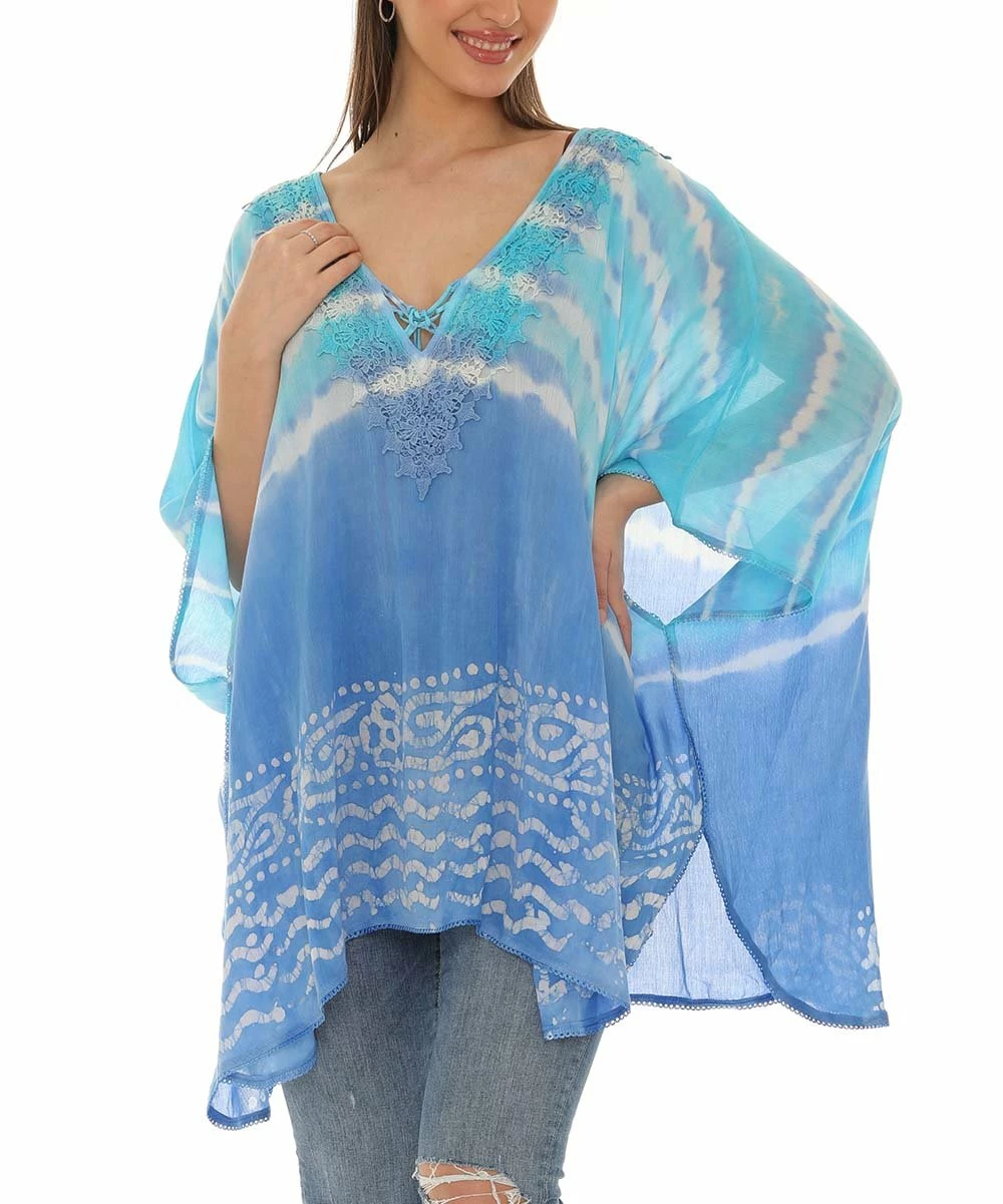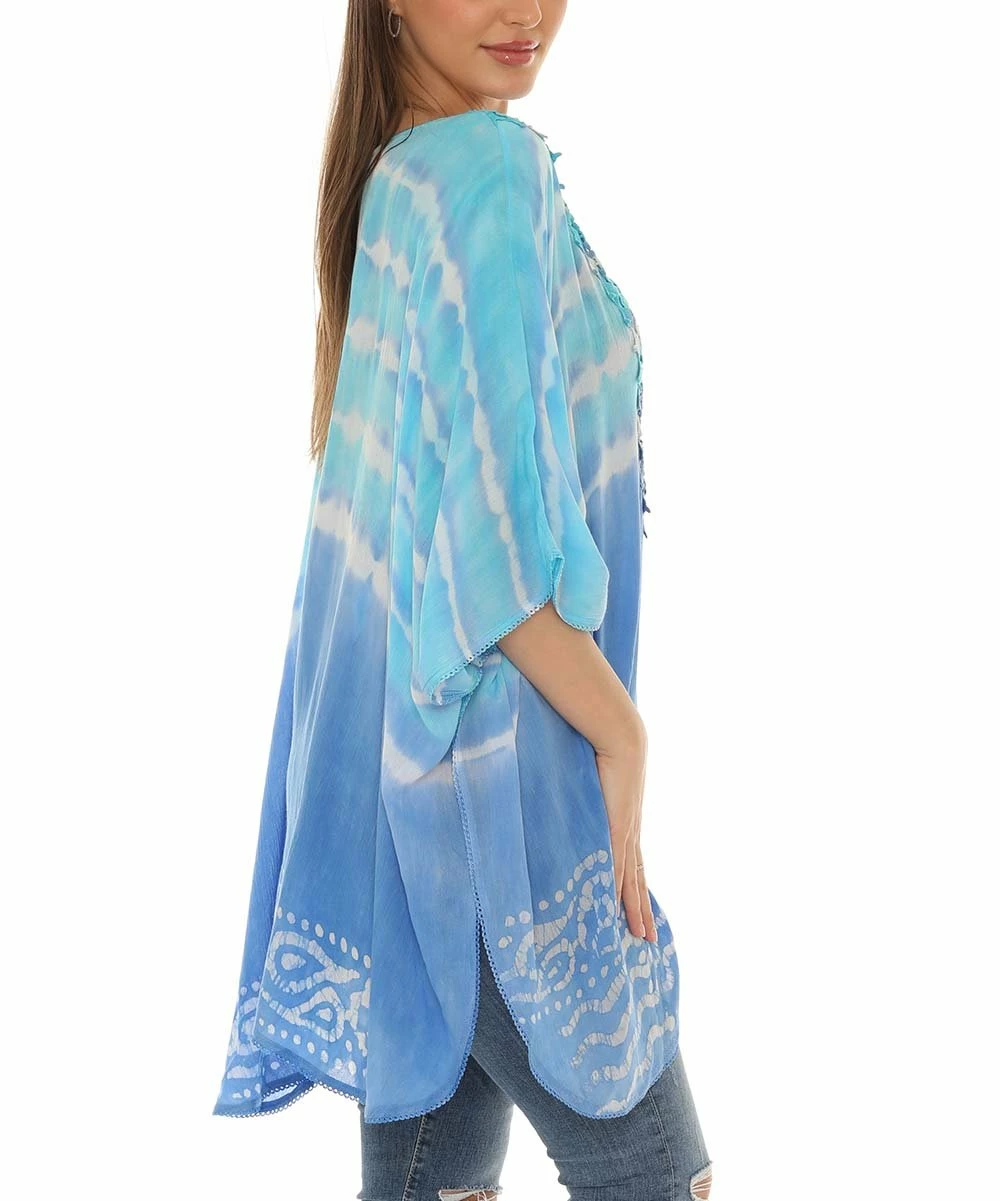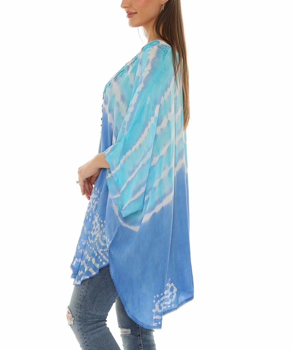 Lightweight and flowy, this colorful tie-dye tunic features lace trim around the neckline.