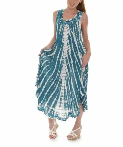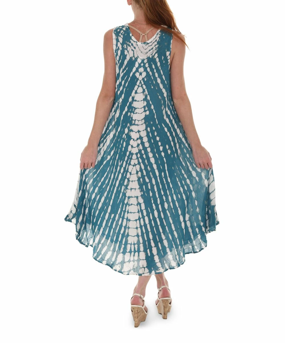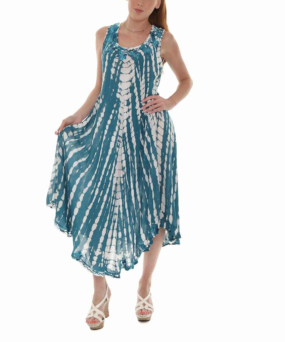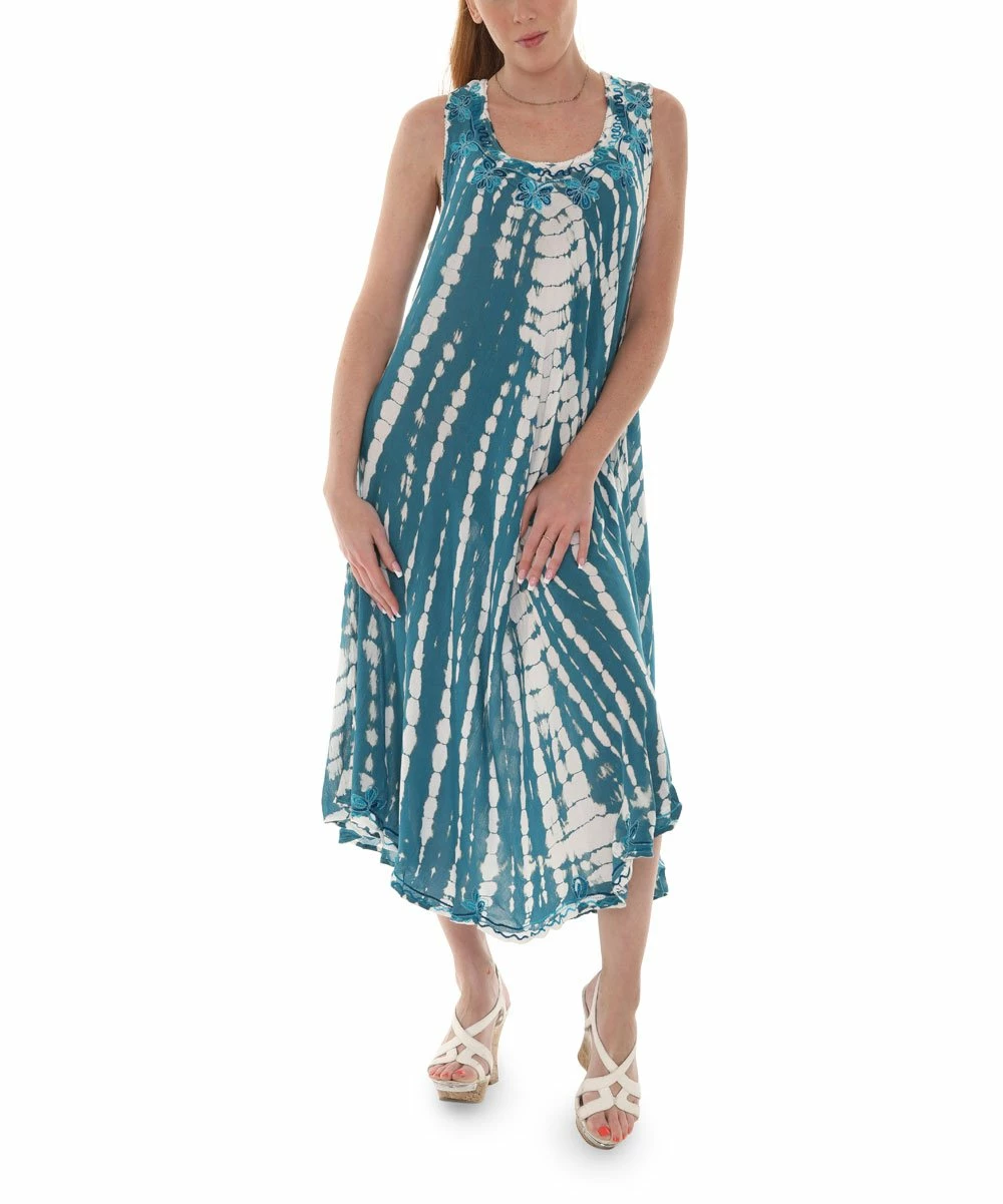 A sleeveless maxi dress with embroidered detail along the scoop neckline and hem.