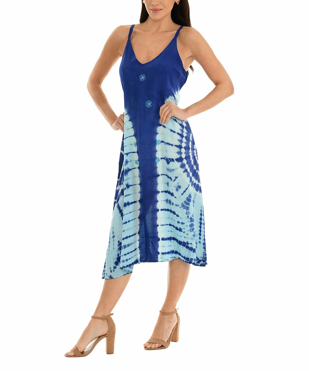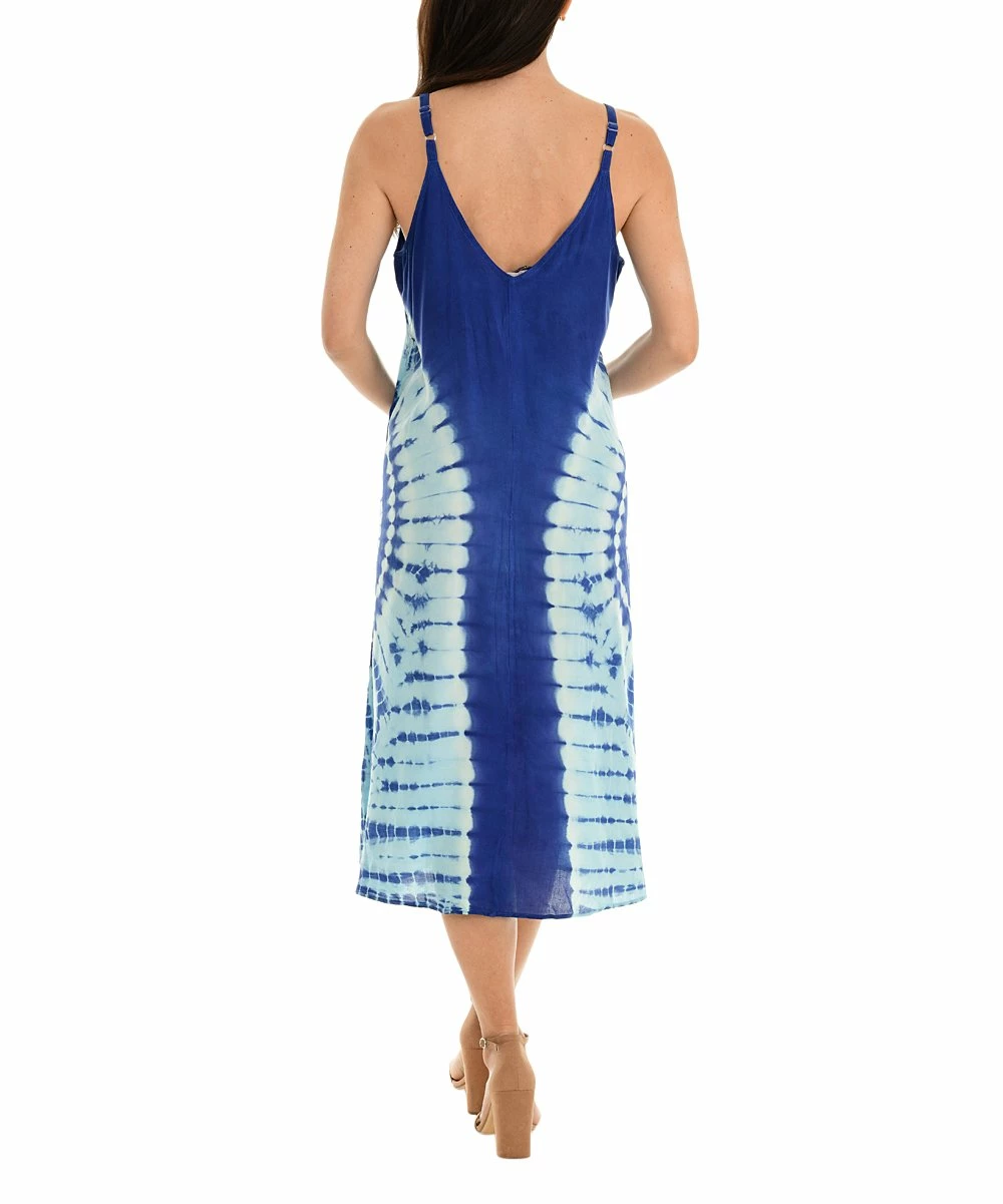 Sleeveless tie-dye shift dress with a flattering v-neck and skinny spaghetti straps.