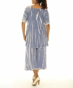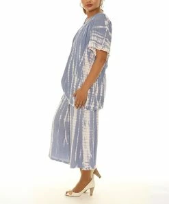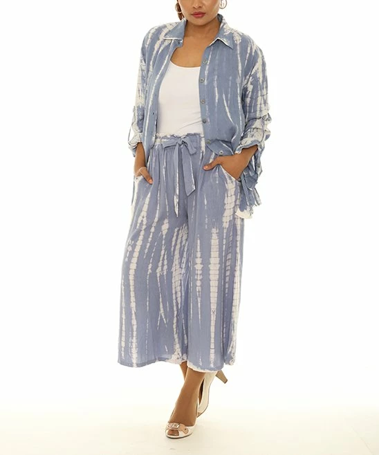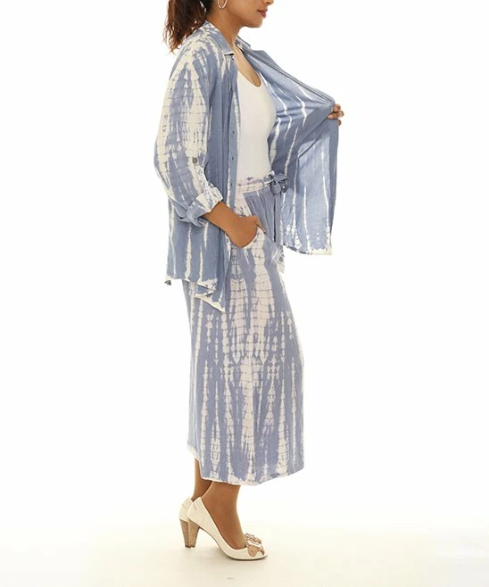 - Includes white tank, blue and white tie-dye button-up and blue and white tie-dye gaucho pants (three pieces total)