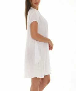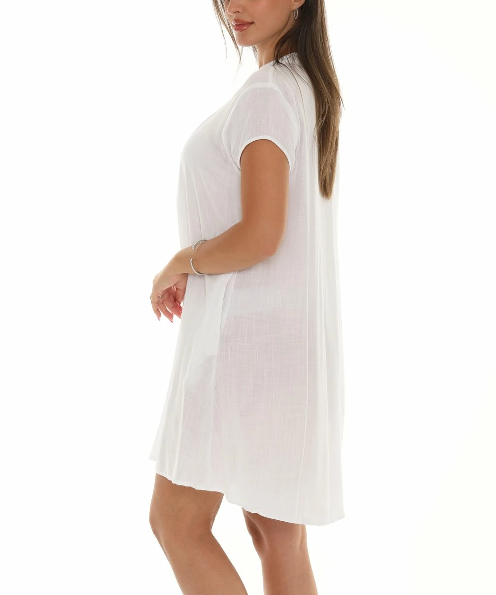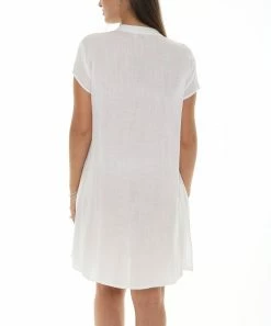 A button-front shift dress sporting a low collar, a subtle hi-low hem and pockets.