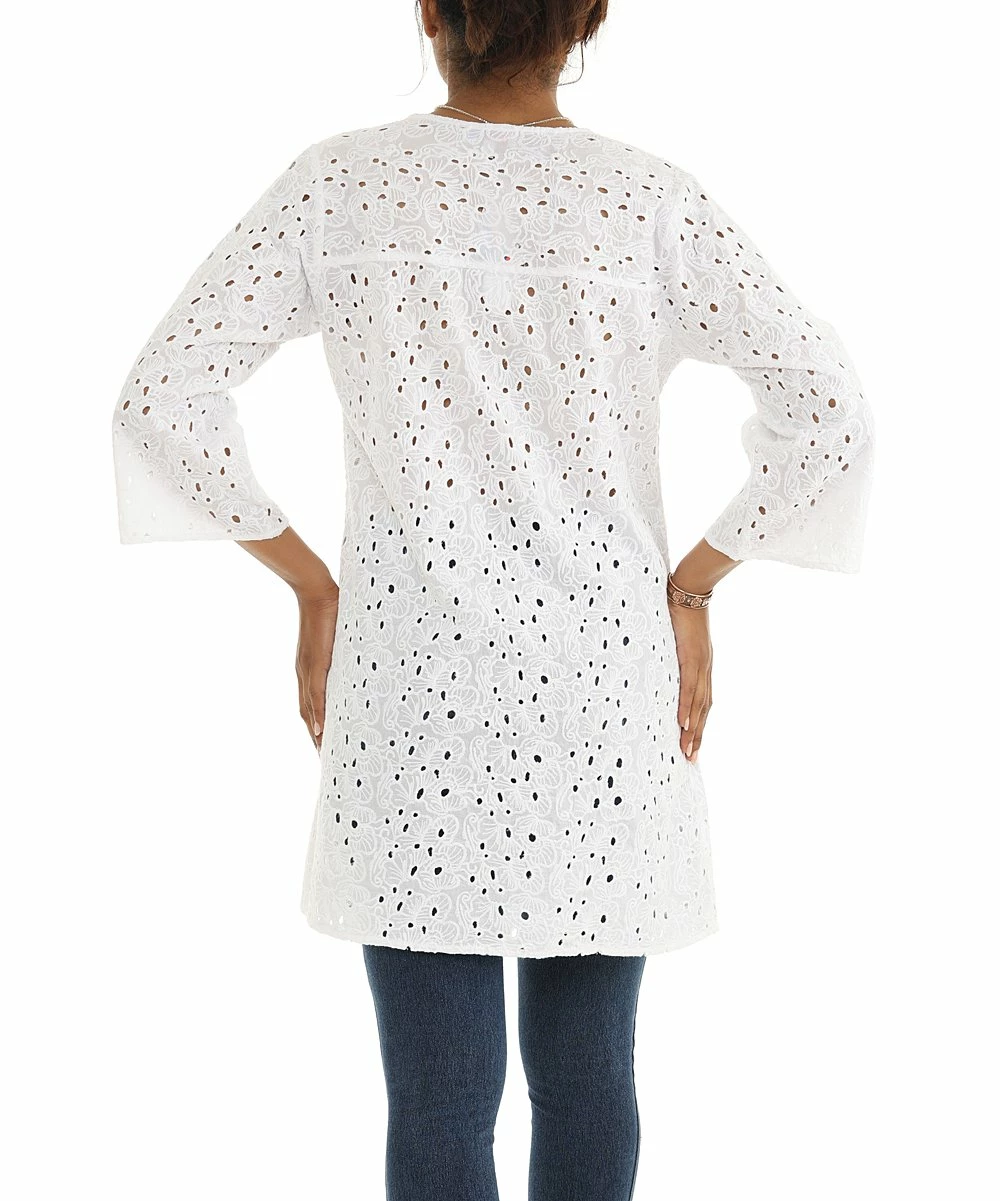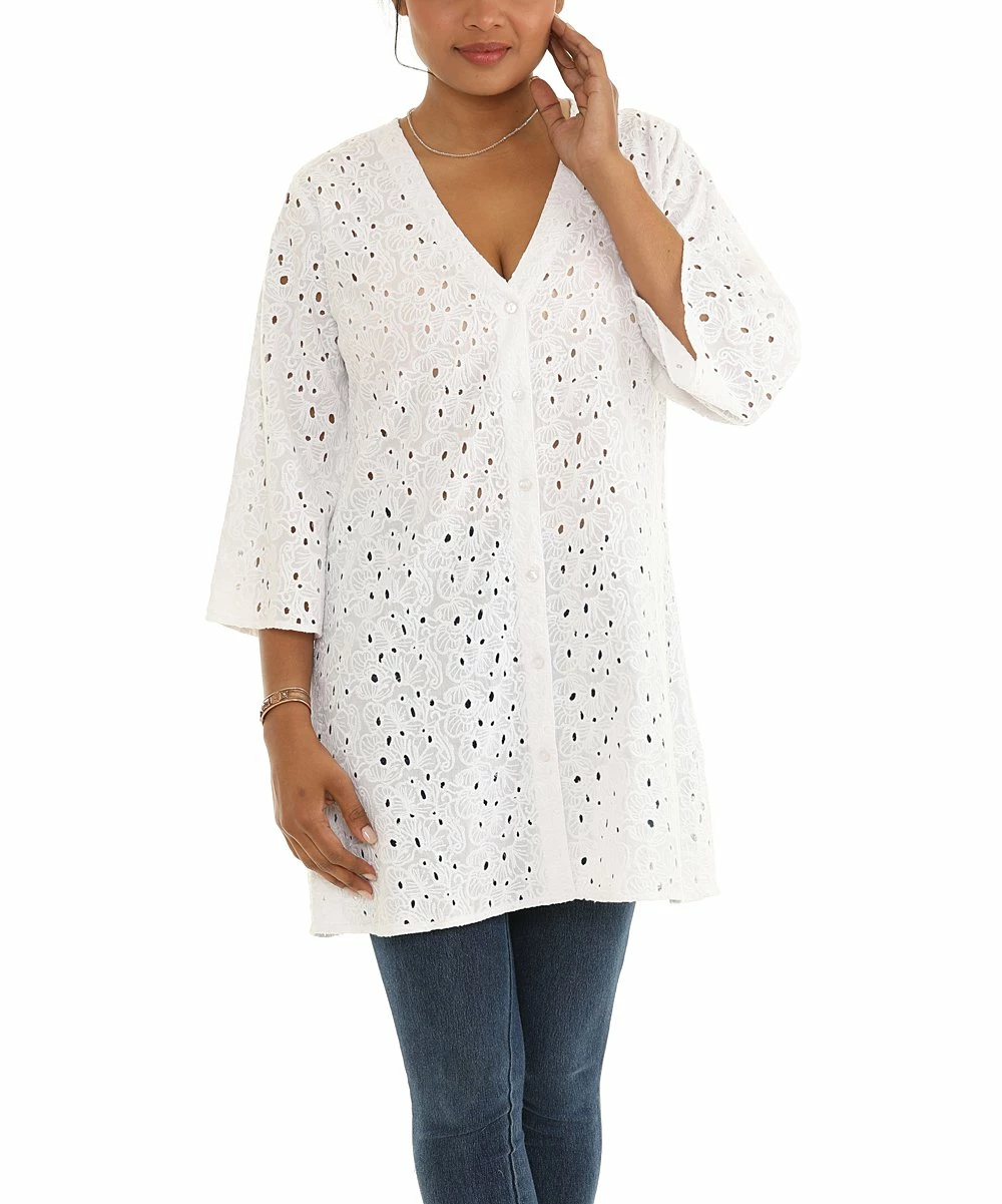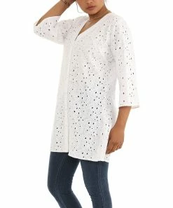 Lighten your look with the airy style of this button-up tunic crafted with cotton eyelet fabric.
