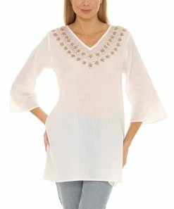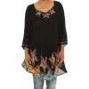 Breeze through your day in this airy tunic featuring a v-neckline with playful embroidering, three-quarter sleeves and side slits.