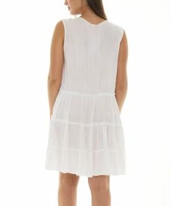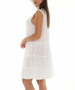 A tiered shift dress featuring a sleeveless design.